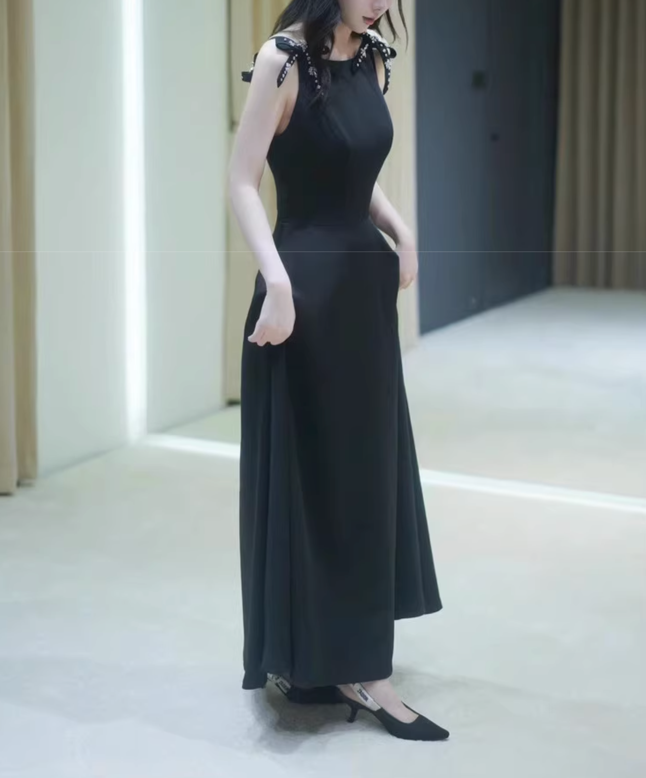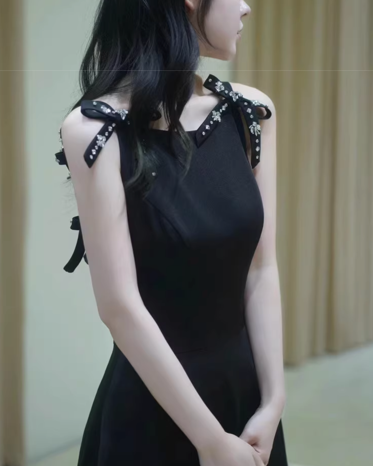 فستان أسود أنيق بدون أكمام، يتميز بأشرطة مزينة بفيونكة رقيقة وتنورة واسعة. تصميم كلاسيكي يجمع بين التألق الرقيق والأناقة الراقية.