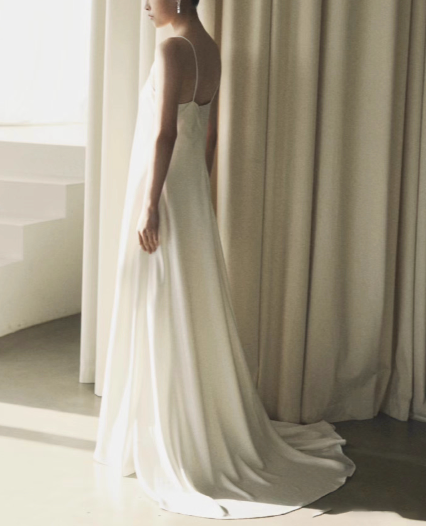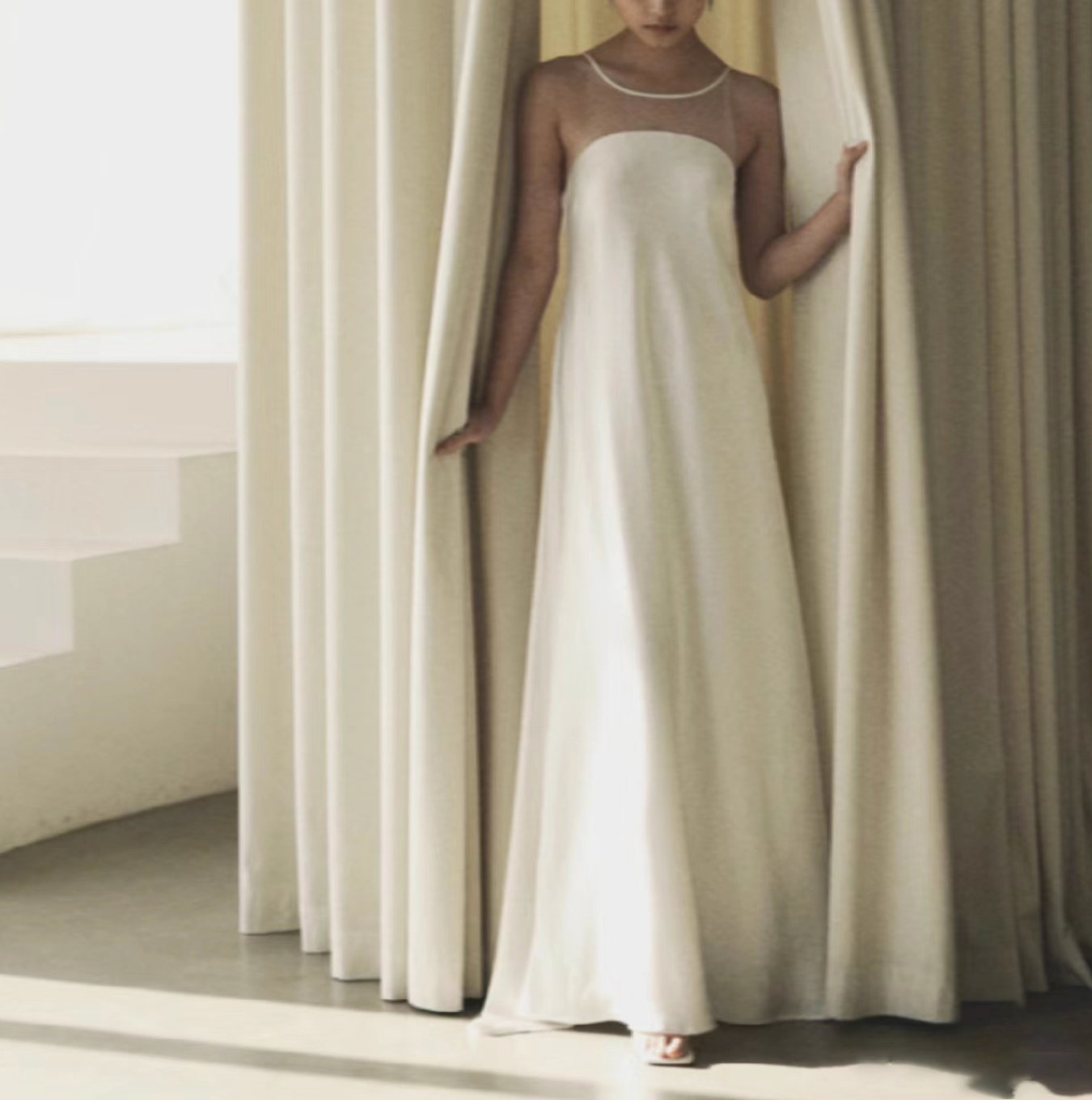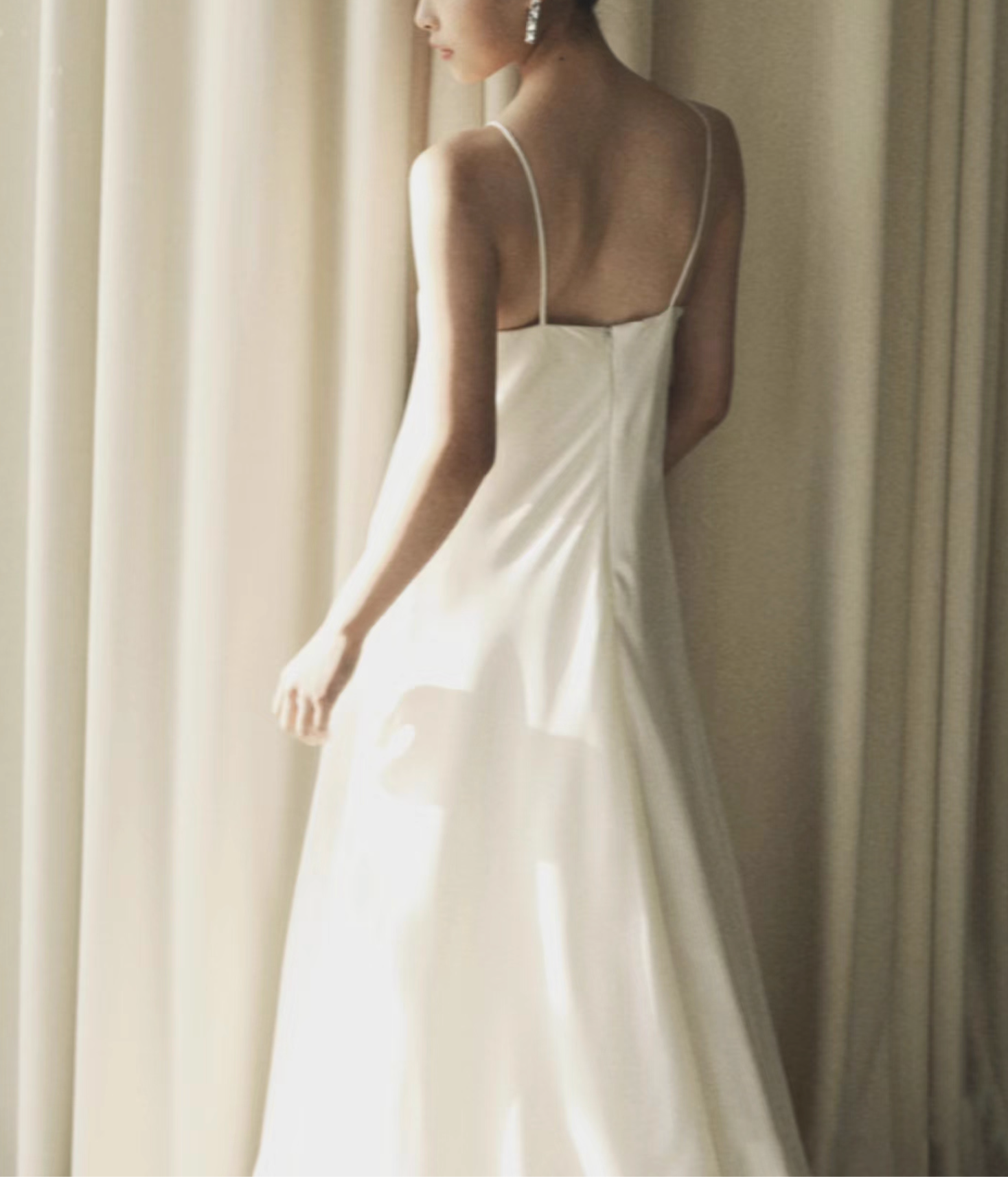 فستان ساتان عاجي بسيط يتميز بقصّة انسيابية أنيقة وتفاصيل رقيقة حول الرقبة، مما يوفر أناقة خالدة للمناسبات الأنيقة.
