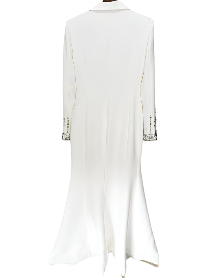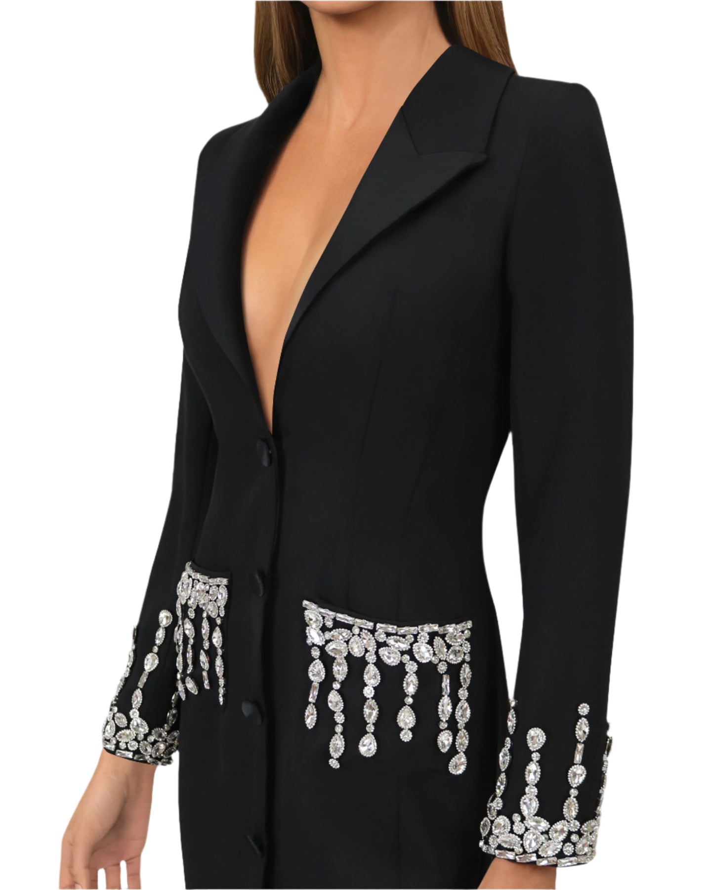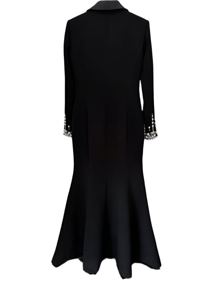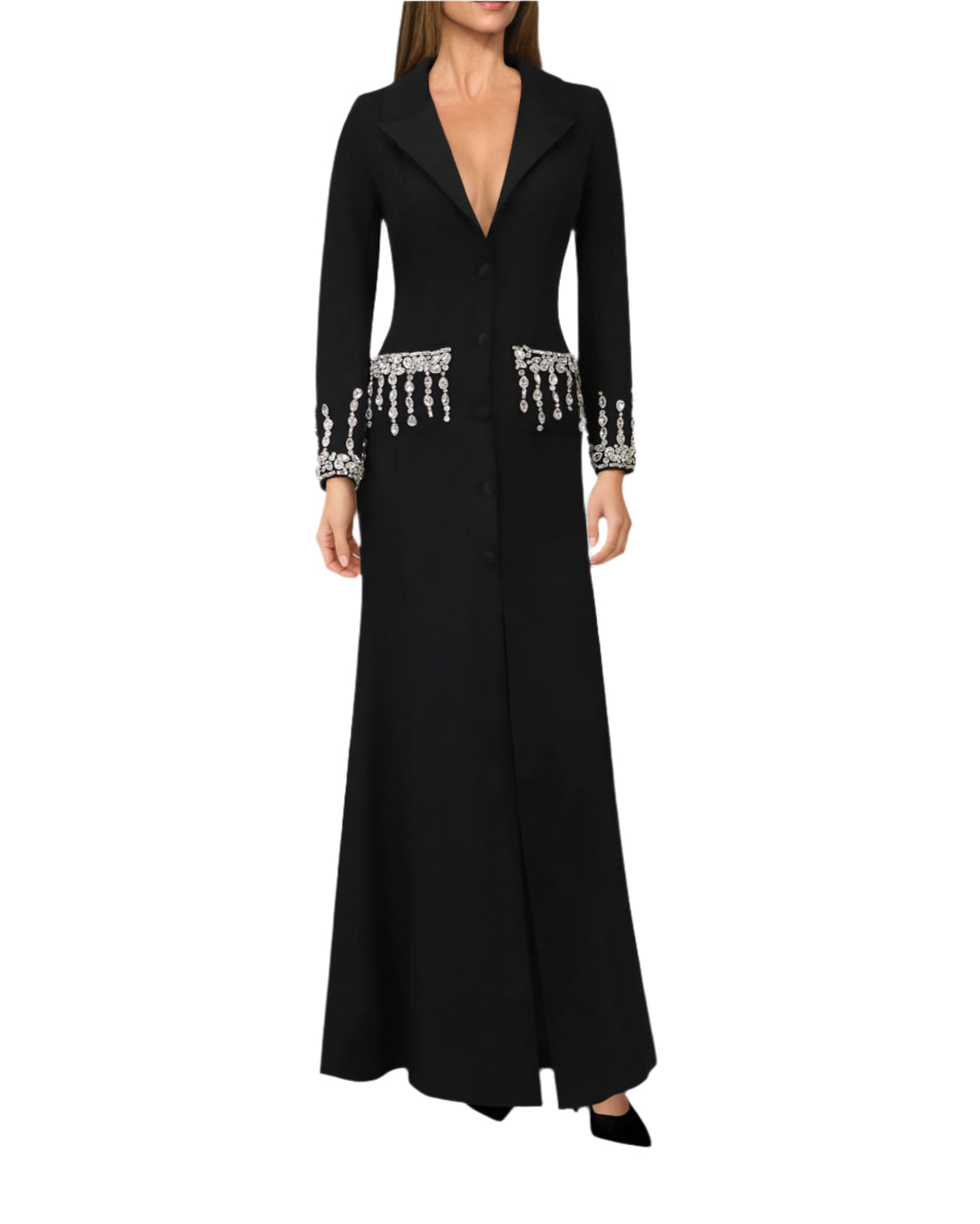 فستان أنيق وراقي بأكمام طويلة مصنوع من قماش غني وفضفاض ومزين بتفاصيل كريستالية معقدة على الأكمام والجيوب. يتميز الفستان بتصميم أنيق بأزرار وياقة ناعمة لإضفاء لمسة من الفخامة. مثالي للمناسبات الرسمية، يجمع هذا الفستان بين التصميم الأنيق والتفاصيل البراقة للحصول على مظهر ملفت للنظر.