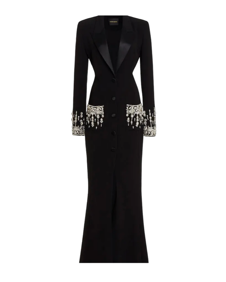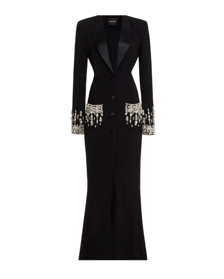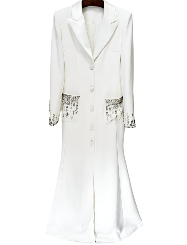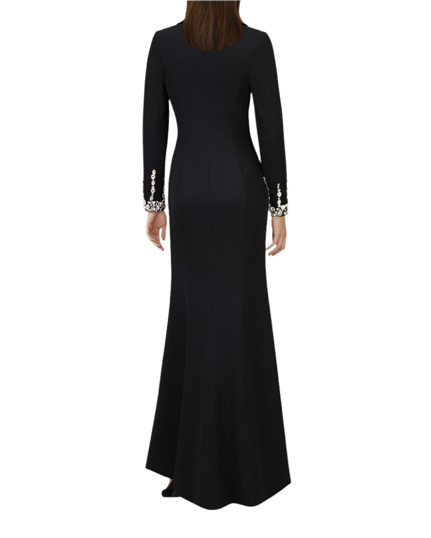 فستان أنيق وراقي بأكمام طويلة مصنوع من قماش غني وفضفاض ومزين بتفاصيل كريستالية معقدة على الأكمام والجيوب. يتميز الفستان بتصميم أنيق بأزرار وياقة ناعمة لإضفاء لمسة من الفخامة. مثالي للمناسبات الرسمية، يجمع هذا الفستان بين التصميم الأنيق والتفاصيل البراقة للحصول على مظهر ملفت للنظر.