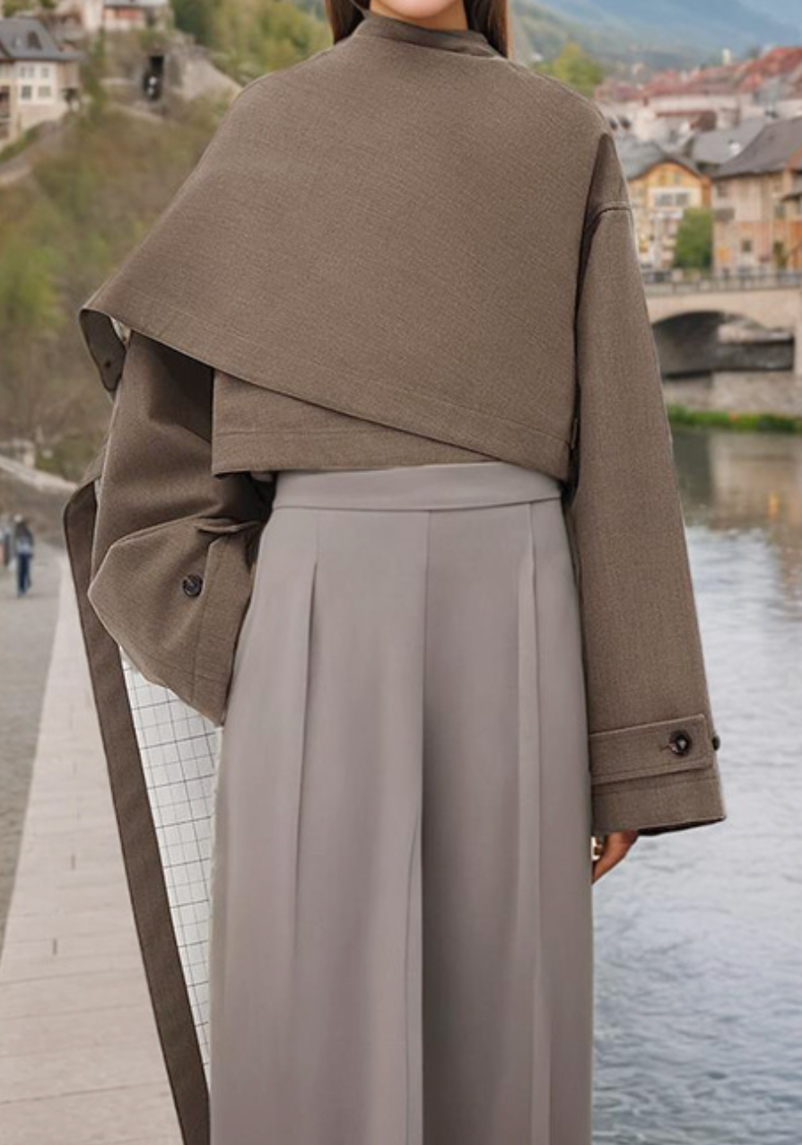 جاكيت عصري قصير بطبقة خارجية غير متماثلة تُضفي أناقةً مميزة على التصميم. صُمم بلون بني داكن غني بأكمام مُصممة وأساور مُفصلة، ليُضفي لمسةً راقيةً وهندسيةً على الطبقات العصرية.