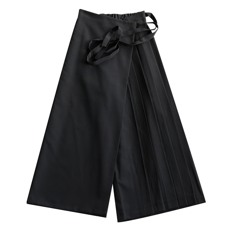 بنطال واسع الساقين بتصميم كلاسيكي أسود، يتميز بقصة أمامية أنيقة ملفوفة وتفاصيل مطوية ناعمة تمنح حرية الحركة. مزود برباط خصر قابل للتعديل، ليمنحكِ إطلالة عصرية تجمع بين الراحة والأناقة المعاصرة.