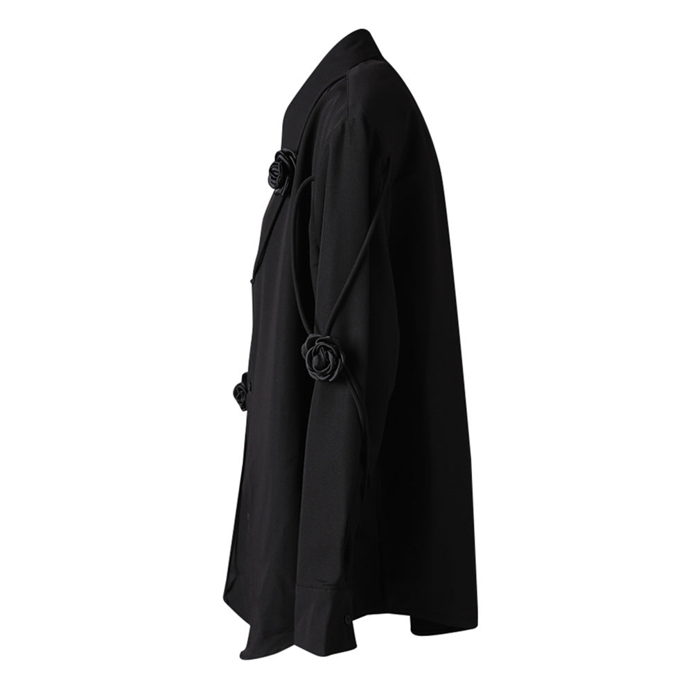 قميص أبيض أنيق بأزرار، مزين بتطريزات زهرية سوداء منحوتة وتفاصيل دقيقة بلون مغاير. يتميز بتصميم أنيق بقصة مستقيمة وأكمام طويلة، مما يضفي لمسة فنية على قطعة كلاسيكية خالدة، مثالي لإطلالة أنيقة من الصباح إلى المساء.