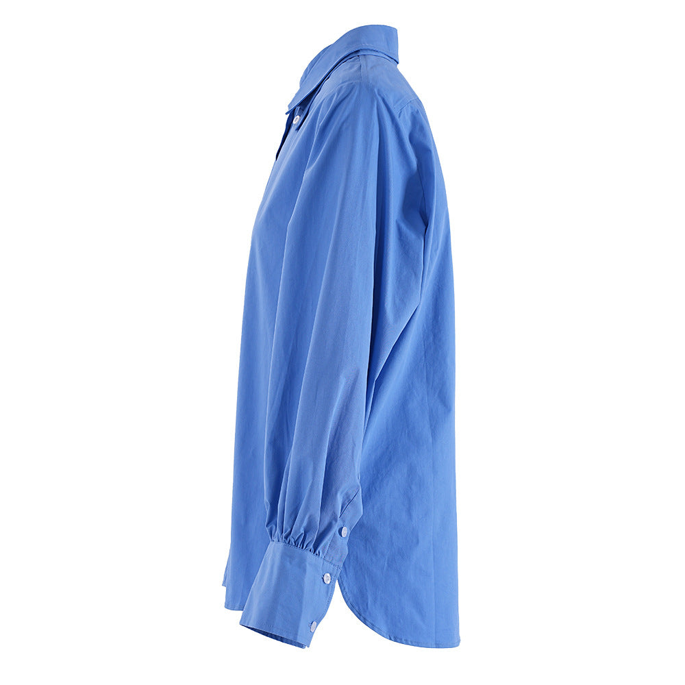 قميص قطني أزرق كلاسيكي بتصميم أنيق، يتميز بواجهة بأزرار أمامية بسيطة وأساور أكمام مكشكشة قليلاً لإضفاء لمسة أنيقة. يأتي القميص بياقة رسمية وقصة مريحة، مما يجعله مثالياً للارتداء اليومي المريح أو لإطلالات العمل الرسمية.
