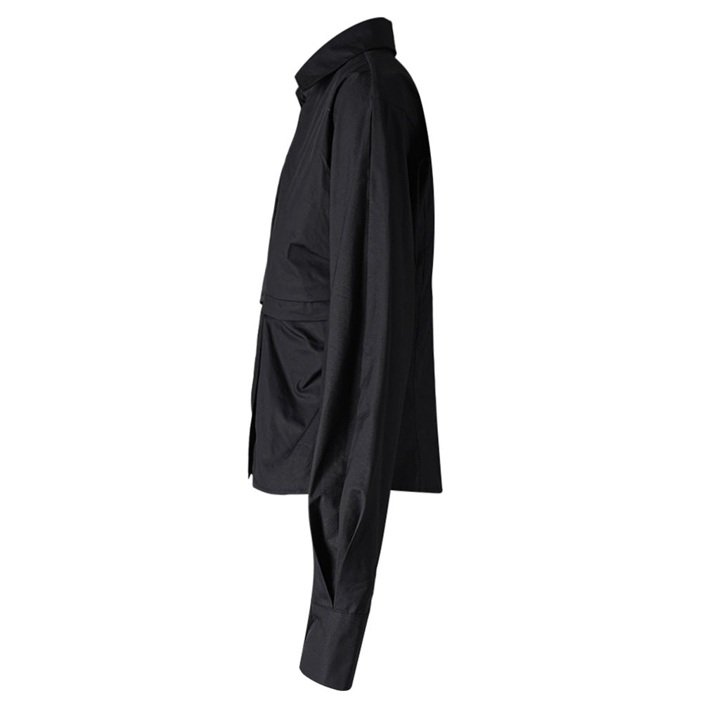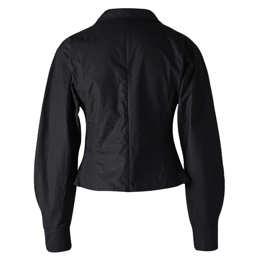 بلوزة سوداء أنيقة بتصميم ياقة على شكل حرف V ملفوفة بشكل جذاب وخصر محدد بشكل ناعم يبرز جمال القوام. تتميز بأكمام طويلة وقصة عصرية أنيقة، مما يجعلها مثالية للعمل ولإطلالات السهرة الراقية.