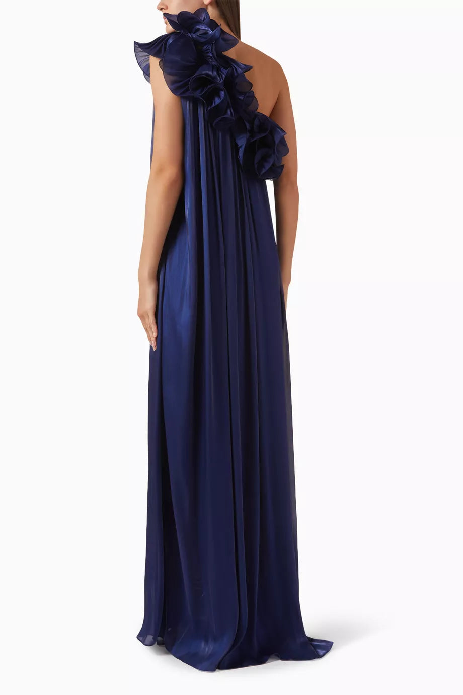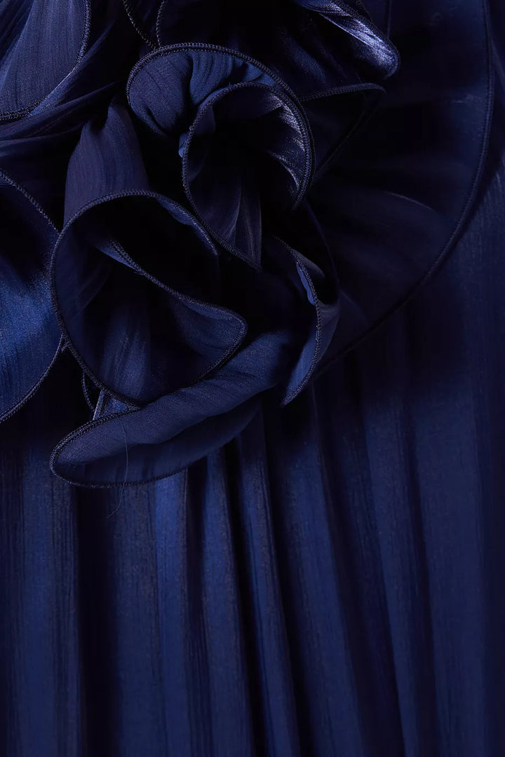 يتميز هذا الفستان الكحلي بكتف واحد بطيات عمودية ناعمة وتصميم مريح ينساب بأناقة على الأرض. يُضفي التطريز الزهري اللافت على خط العنق حجمًا ولمسة راقية، مما يخلق توازنًا مثاليًا بين الفخامة العصرية والأناقة الخالدة. مثالي لحفلات الاستقبال أو الأمسيات الرسمية أو المناسبات الخاصة.