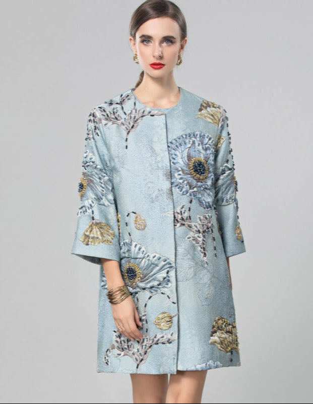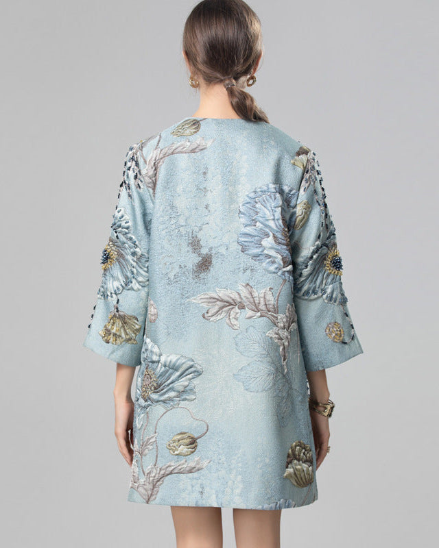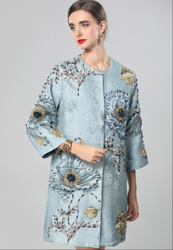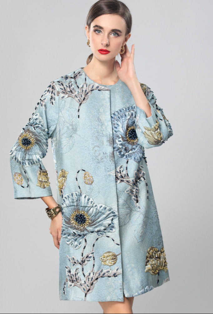 سترة فاخرة من البروكار الأزرق الفاتح، مزينة بتطريزات زهرية معقدة، وأكمام بطول ثلاثة أرباع. تصميمها المنظم وملمسها الفني يجعلها قطعة مميزة متعددة الطبقات.