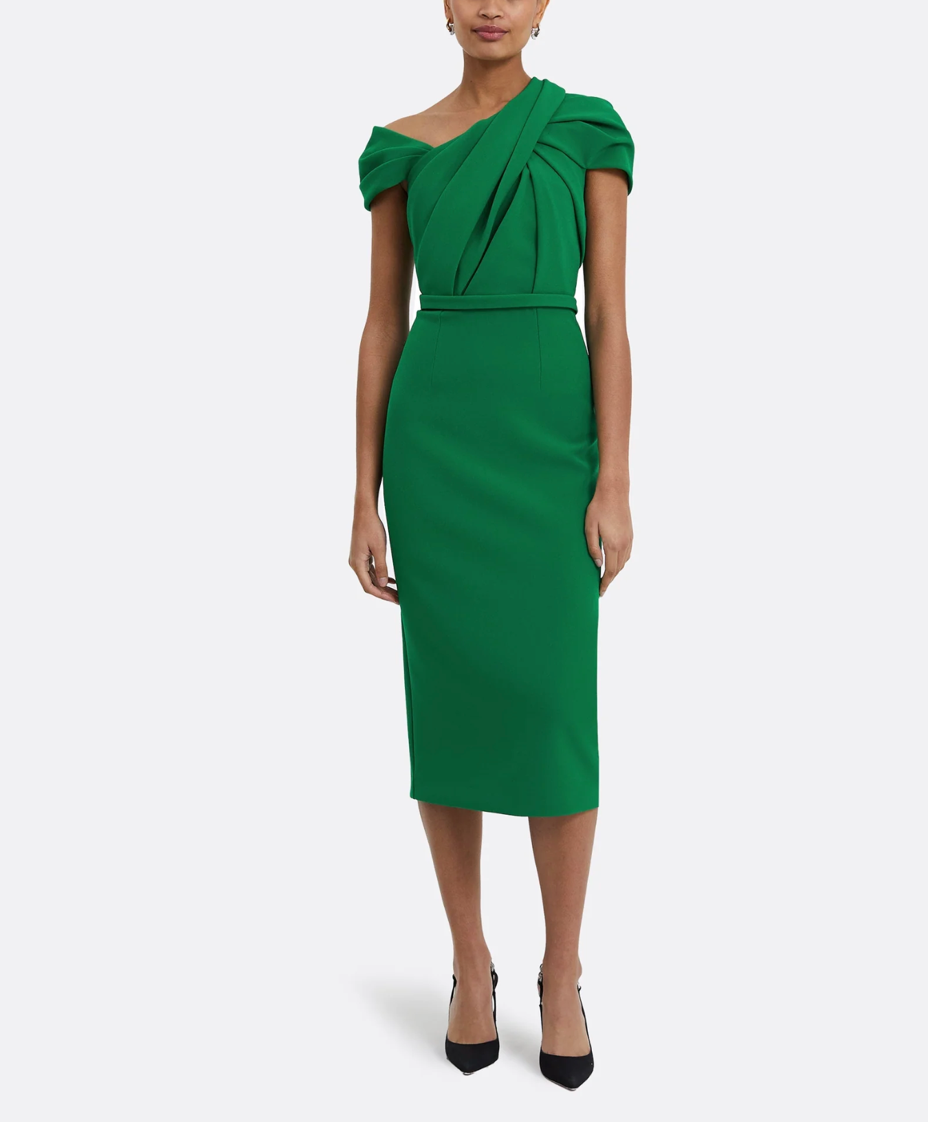 فستان ضيق أخضر زمردي جذاب، يتميز بفتحة رقبة مكشوفة الكتفين مع طيات بارزة وخصر ضيق. تصميمه الأنيق ينضح بالأناقة والأنوثة العصرية، مثالي لحفلات الكوكتيل والمناسبات المسائية.