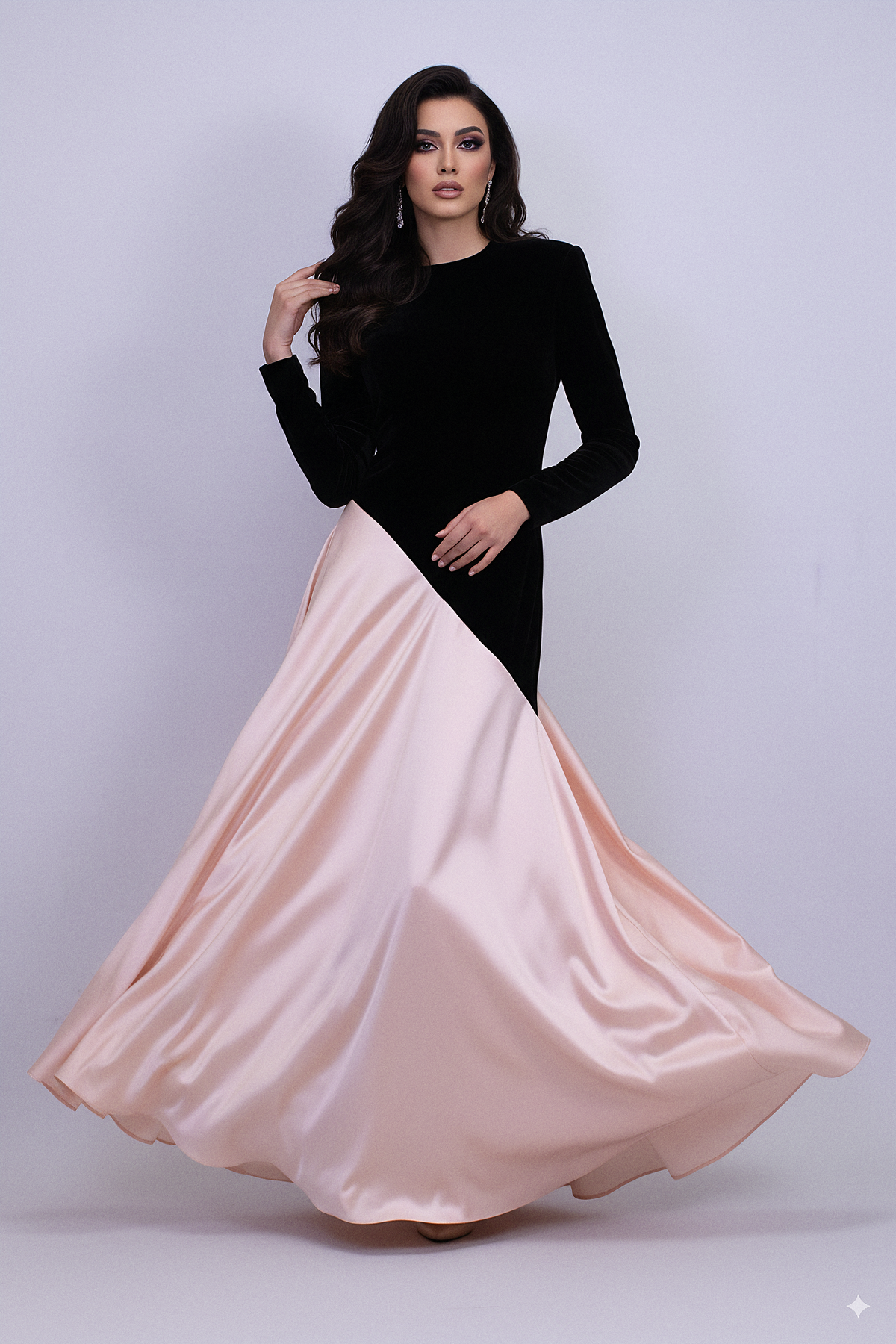 فستانٌ أنيقٌ يمزج بين المخمل الأسود والساتان الوردي الناعم بتصميمٍ قطريٍّ جريء. بأكمامٍ طويلة وتنورةٍ انسيابية، يُضفي أناقةً عصريةً بتباينٍ خالد.