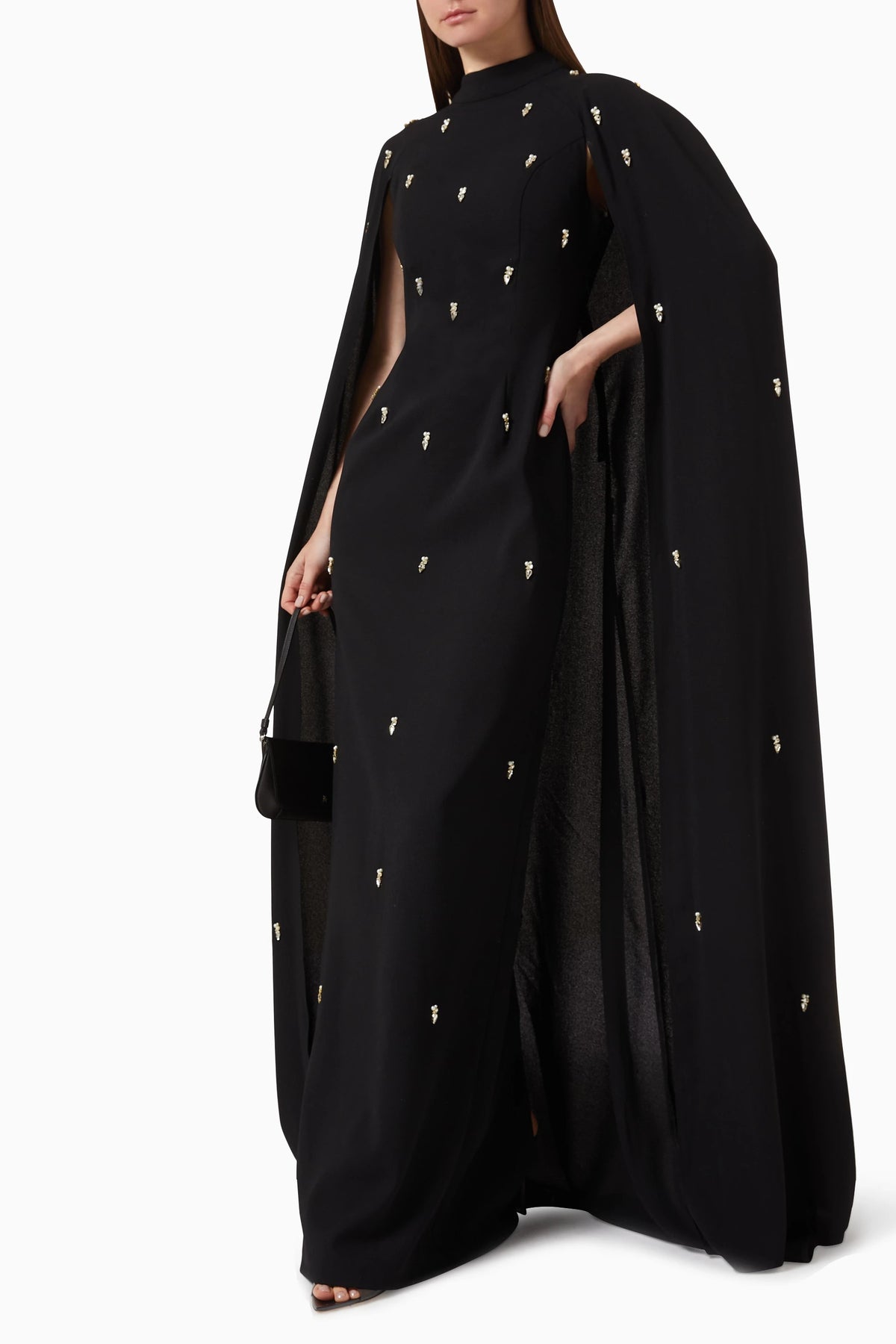 فستان أسود أنيق بكاب طويل، مزين بكريستالات متناثرة لإضفاء لمسة من التألق. ياقة عالية وتصميم أنيق يجعله خيارًا أنيقًا لحفلات المساء والمناسبات الراقية.