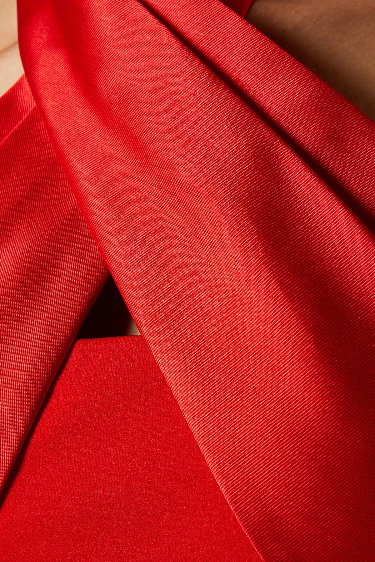 فستان ساتان أحمر مذهل يتميز بفتحة رقبة متقاطعة وألواح منسدلة منظمة تتدفق في ذيل ضخم - تجسيد للجاذبية والثقة الخالدة.
