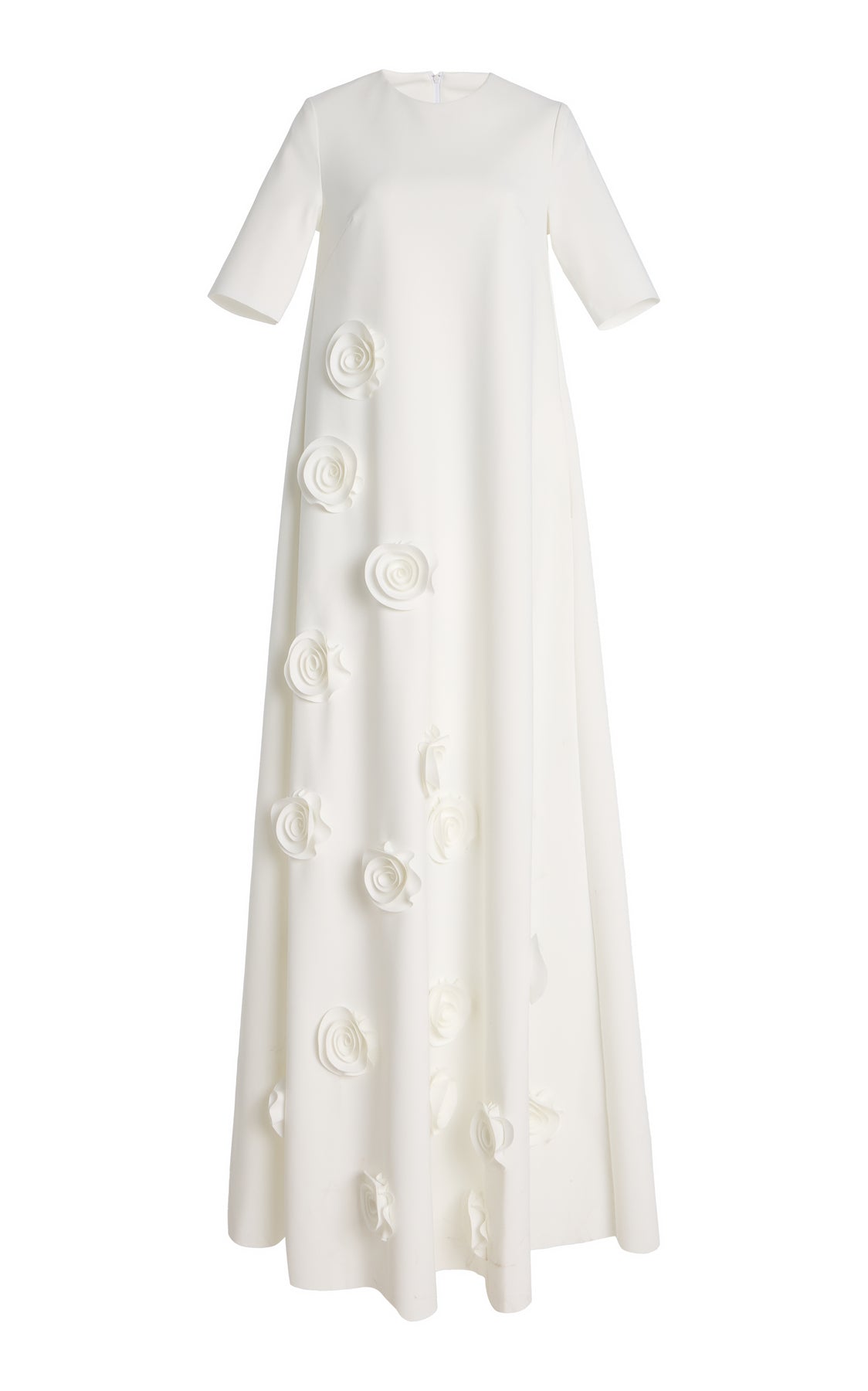 فستان فوشيا أنيق مزين بتطريزات زهور ثلاثية الأبعاد متدفقة على طول التنورة. مصمم بأكمام قصيرة وقصة انسيابية لإطلالة عصرية أنثوية أنيقة.