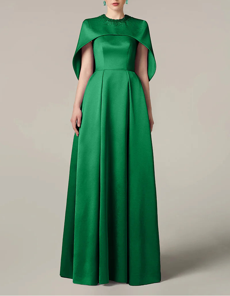 فستان ساتان زمردي ساحر، يتميز بتصميم أنيق مع عباءة قصيرة مزينة بزخارف متناسقة. تضفي التنورة المكسوة على شكل حرف A لمسة من الأناقة الملكية والرقي الخالد.