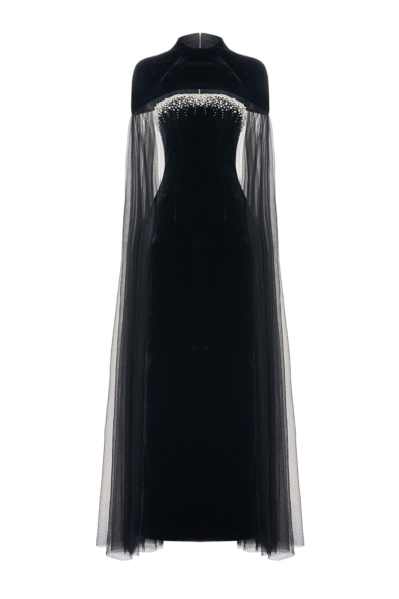 فستان مخملي أسود ساحر، يتميز بقصّة ضيقة مزينة بخرز من اللؤلؤ والكريستال على الصدر. ينسدل عباءة التول الشفافة الرقيقة برشاقة من الكتفين، مما يضفي سحرًا سماويًا دراماتيكيًا على هذه الإطلالة المسائية الرائعة.