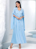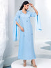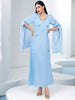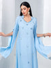 فستان عمودي ساحر باللون الأزرق السماوي، مزين بزخارف النجوم، بأكمام واسعة متدفقة لإطلالة أنيقة وساحرة.
