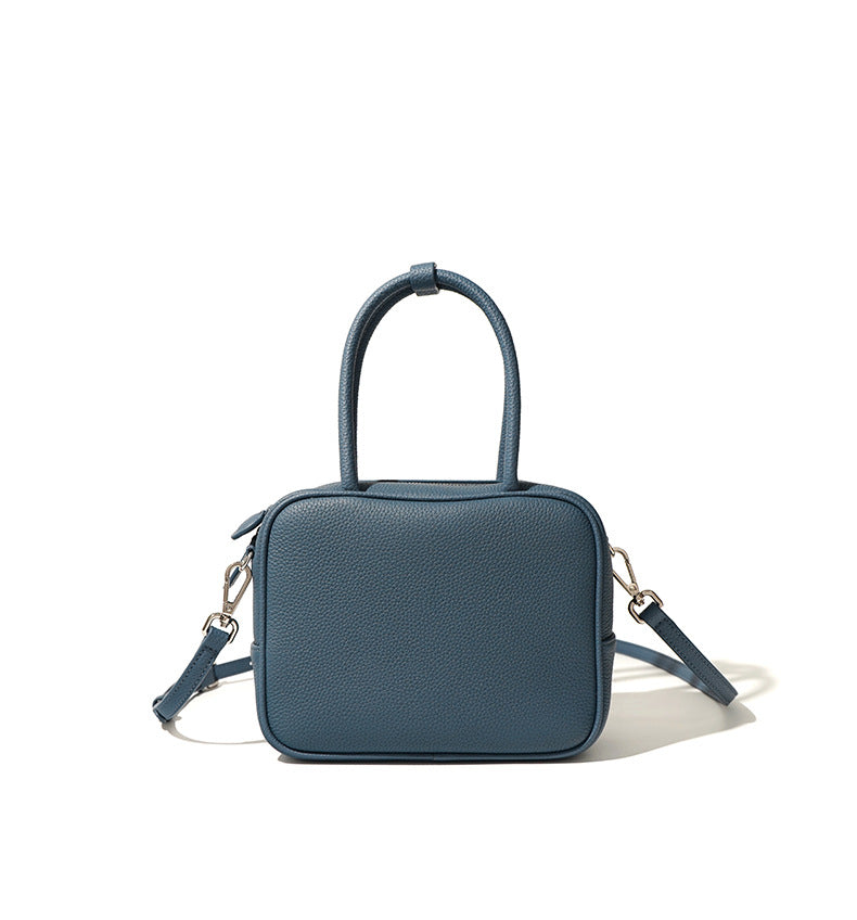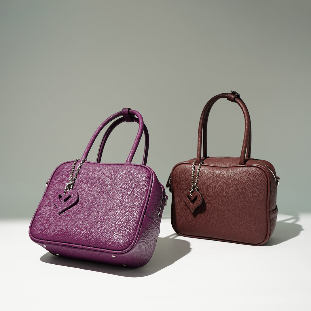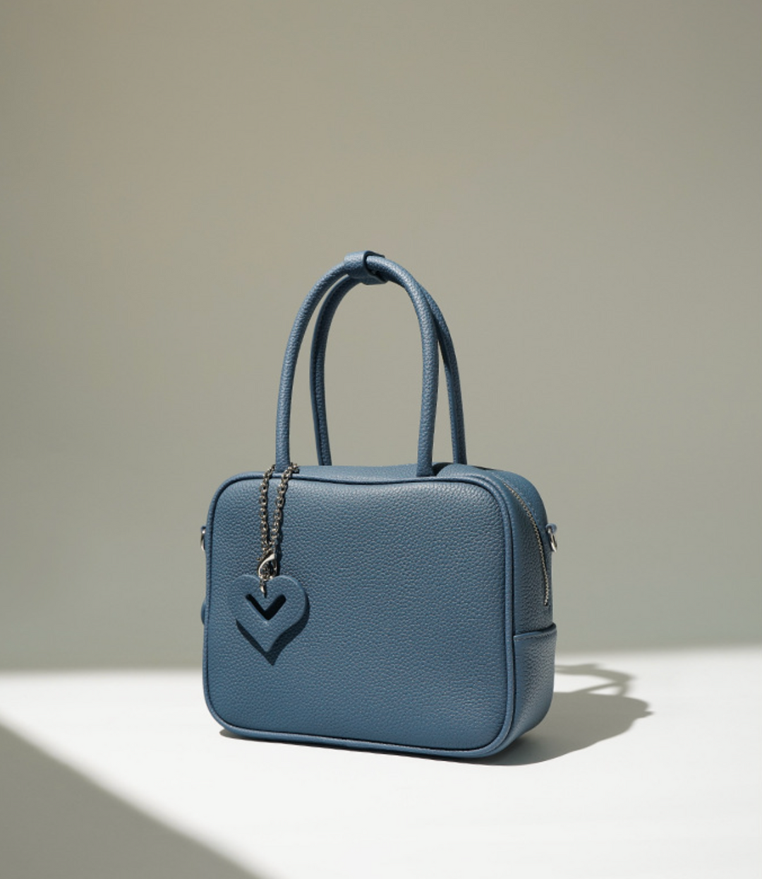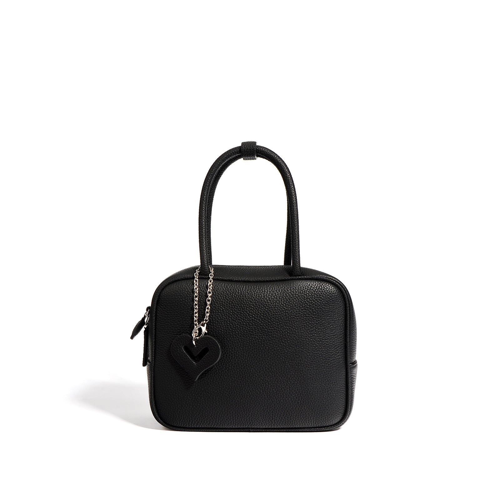 حقيبة يد صغيرة منظمة من الجلد الأسود المحكم، مع لمسة نهائية على شكل قلب متناسق ومقابض علوية مزدوجة - أنيقة ومتعددة الاستخدامات لأسلوب النهار والليل.