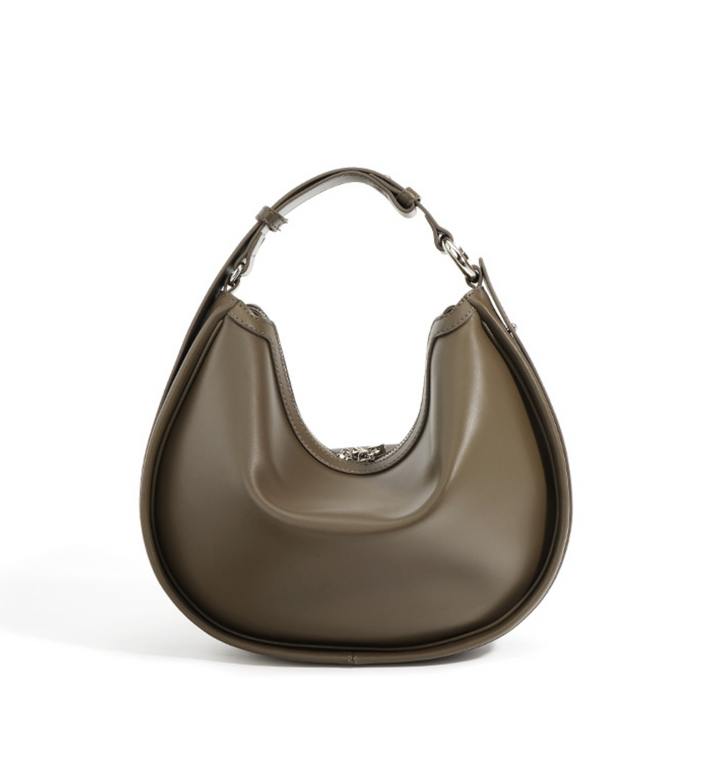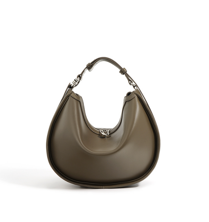حقيبة كتف هلالية معاصرة مصنوعة من جلد ناعم بلون الزيتون، مع إغلاق بسحاب علوي أنيق وتصميم منحني - أنيقة بكل سهولة للارتداء اليومي الحديث.