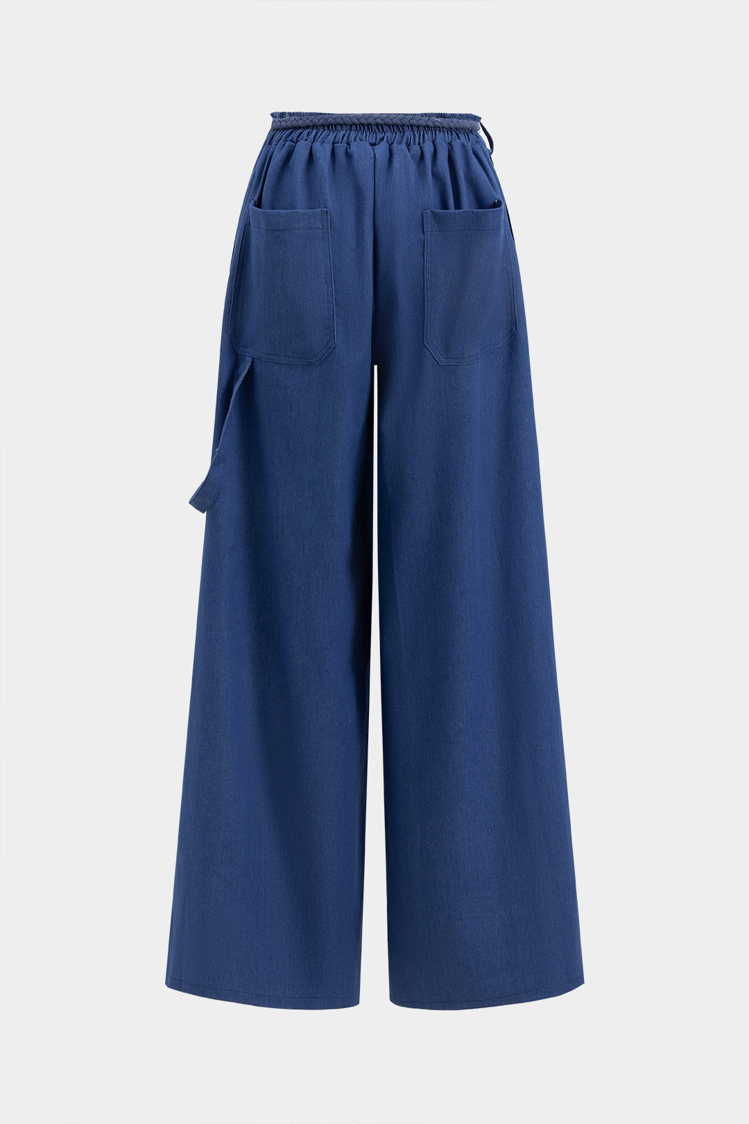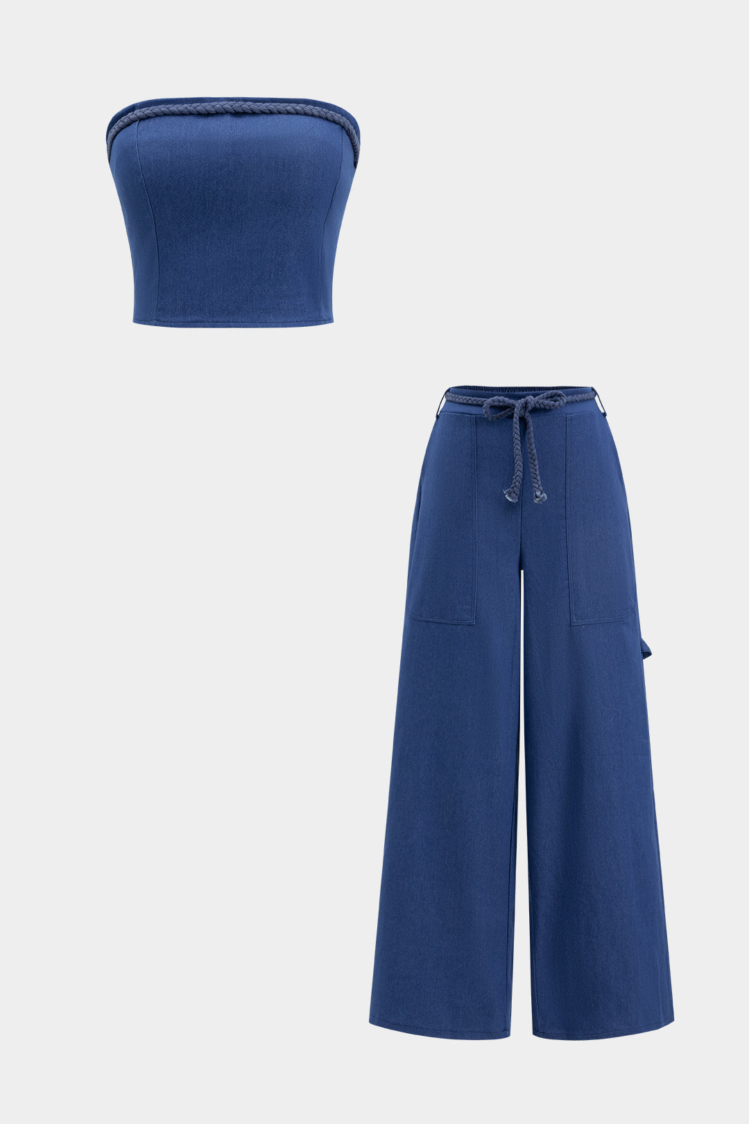 Denim Tube Top And Ruched Tie Front Pocket Wide Leg Jeans Set