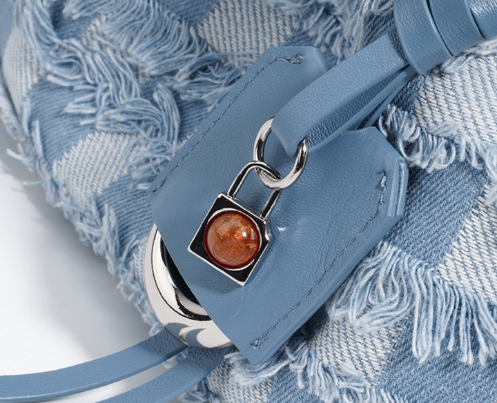 حقيبة دلو من قماش الدنيم المهترئ مع جراب جلدي – إنديغو
