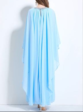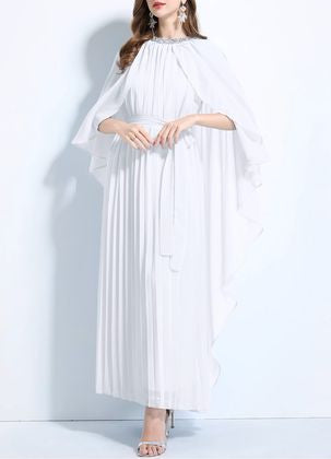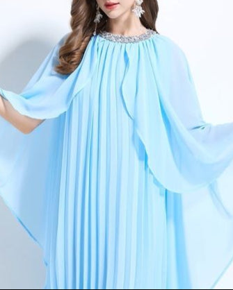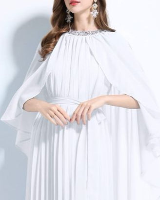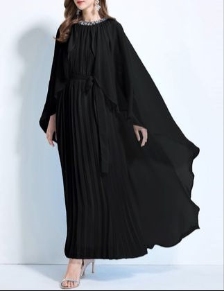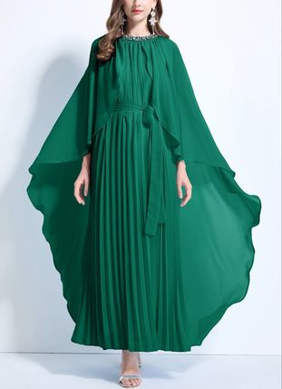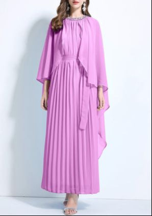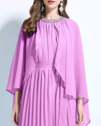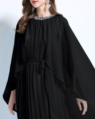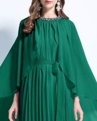 فستان ماكسي مطوي يتميز بعباءة أنيقة منسدلة وياقة مزينة بالكريستال. يضفي الحزام على الخصر لمسة من الأناقة، بينما تضفي العباءة الشيفون المنسدلة لمسة من الرقي.