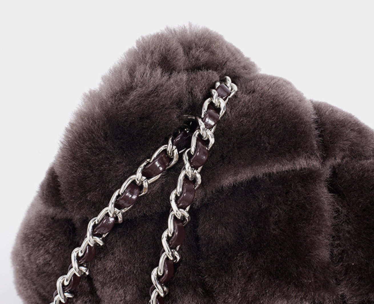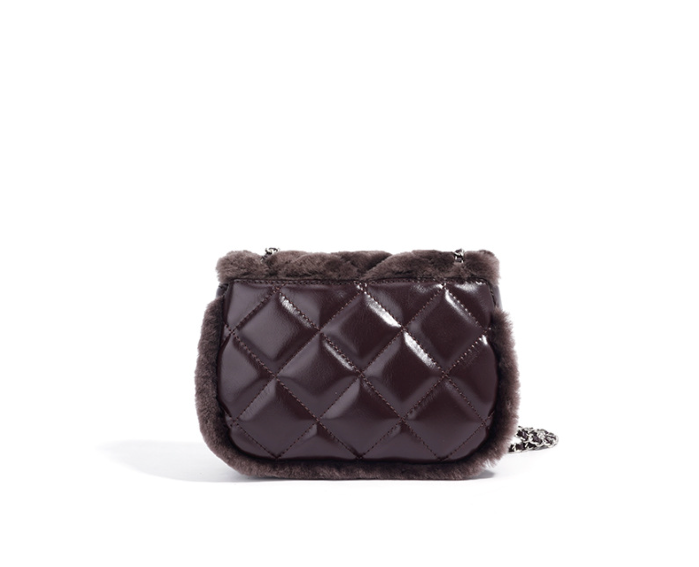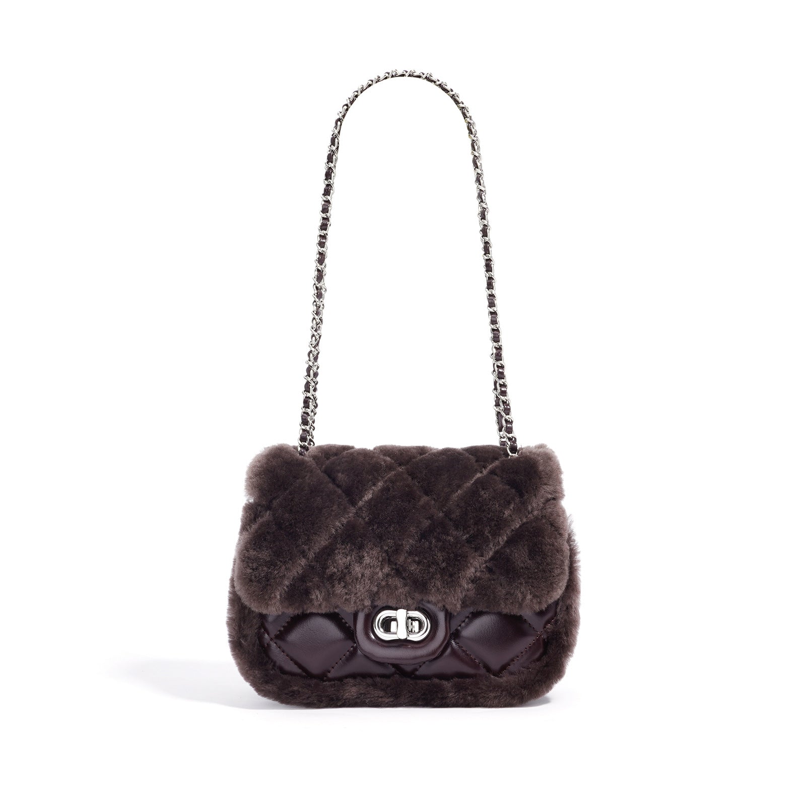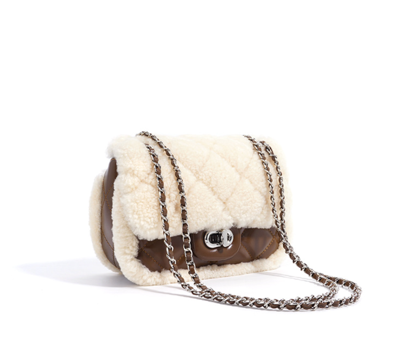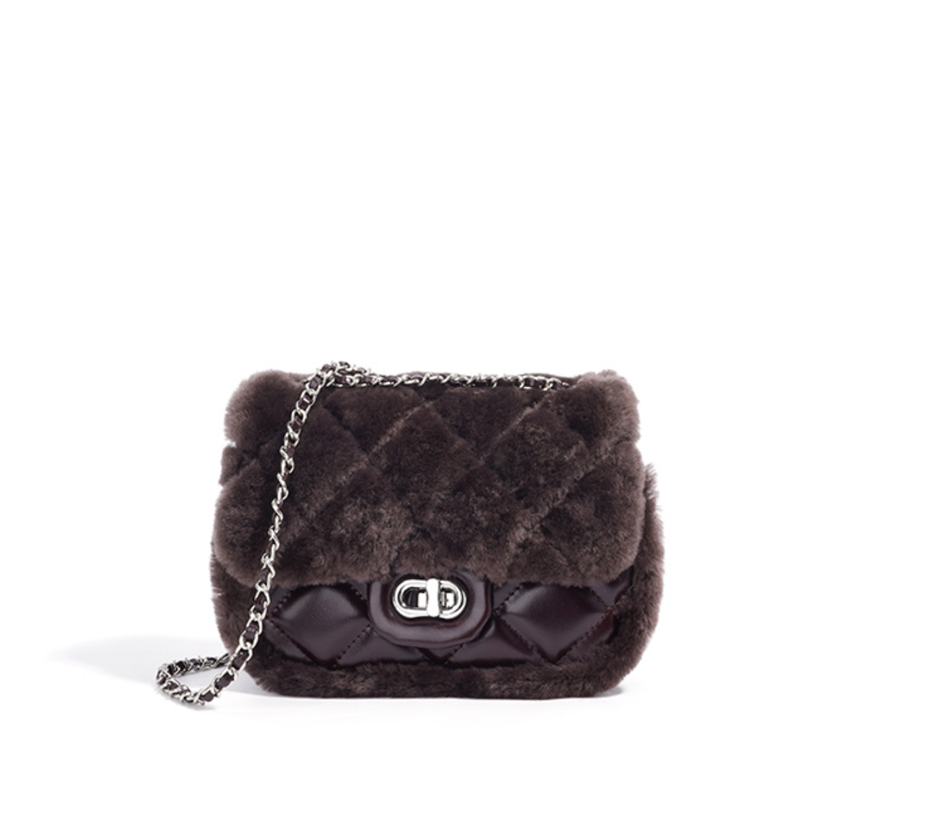 حقيبة كروس بودي بلون الكاكاو، ناعمة للغاية مع فرو صناعي مبطن وتفاصيل جلدية، تُضفي لمسةً من الفخامة الدافئة على إطلالتك الشتوية. تتميز بقفل لولبي وحزام سلسلة فضي اللون لإطلالة ساحرة.