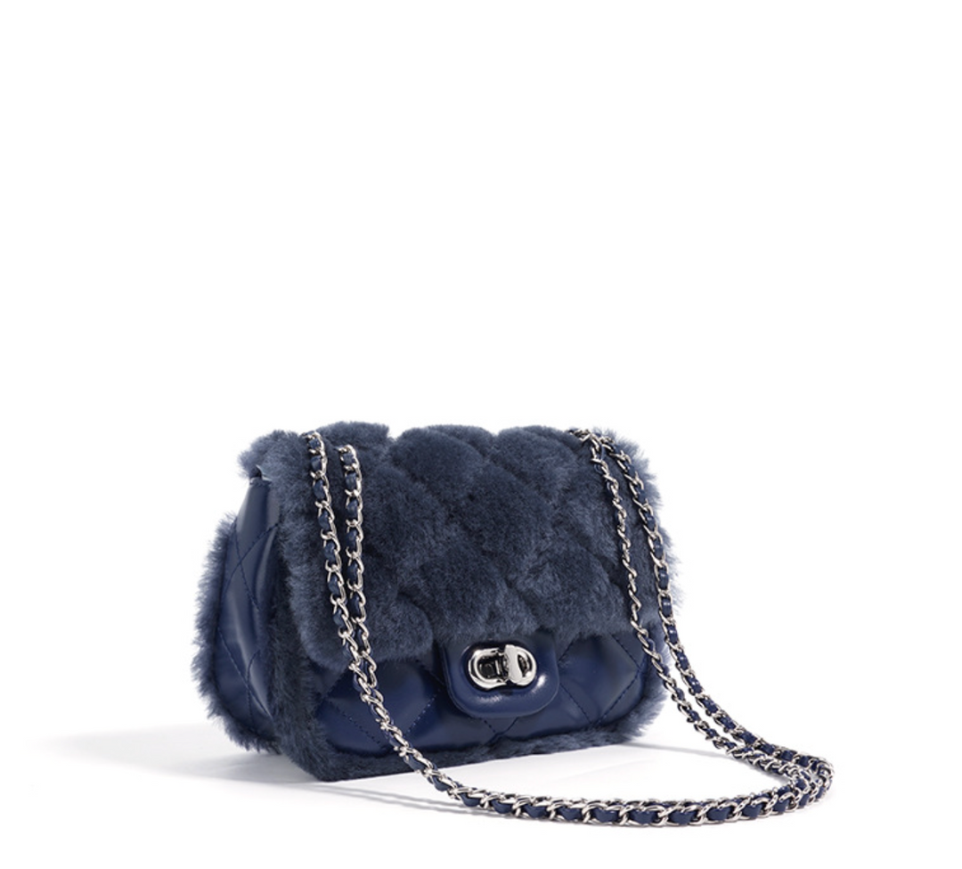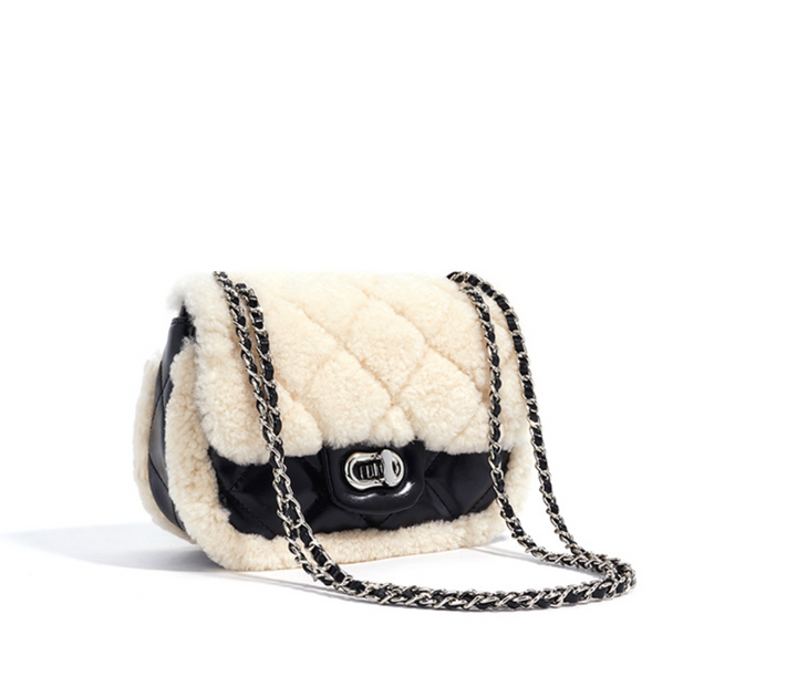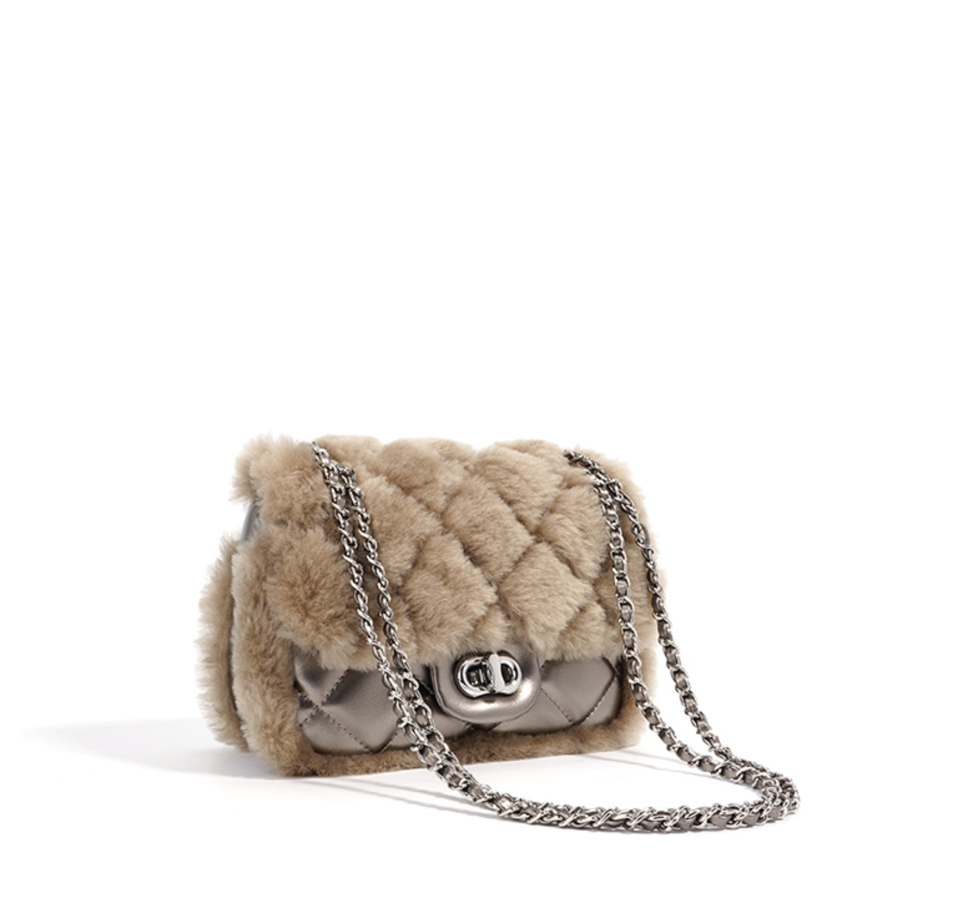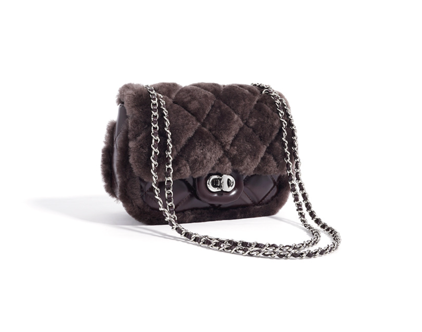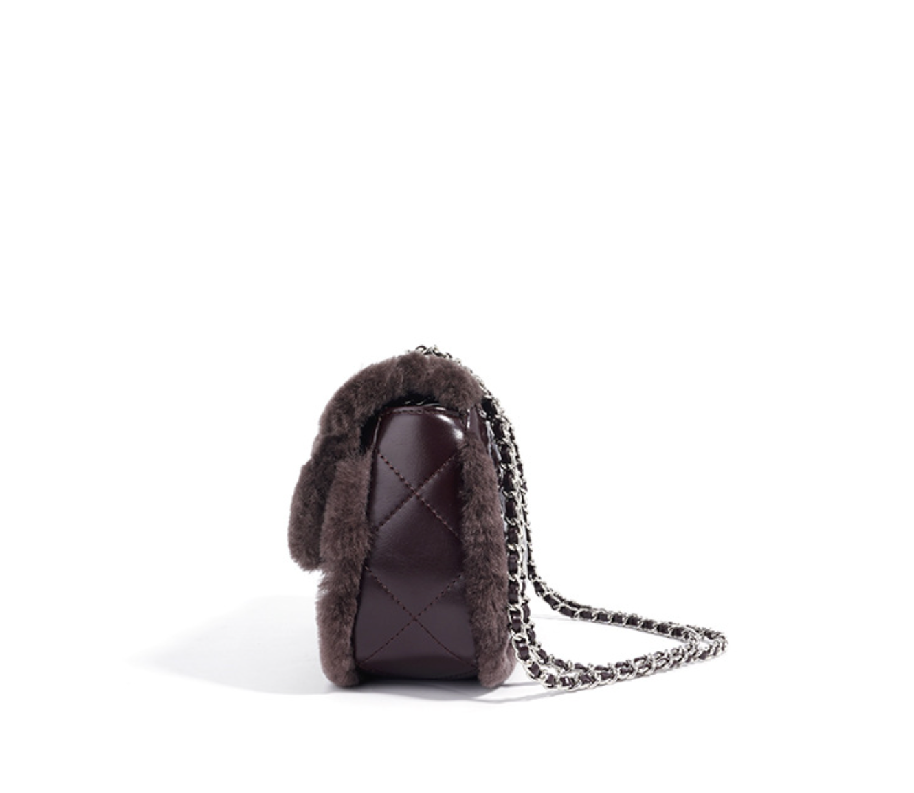 حقيبة كروس بودي بلون الكاكاو، ناعمة للغاية مع فرو صناعي مبطن وتفاصيل جلدية، تُضفي لمسةً من الفخامة الدافئة على إطلالتك الشتوية. تتميز بقفل لولبي وحزام سلسلة فضي اللون لإطلالة ساحرة.