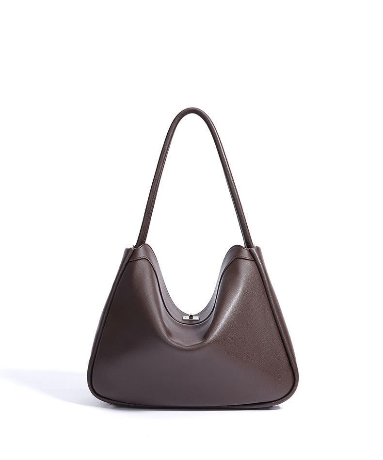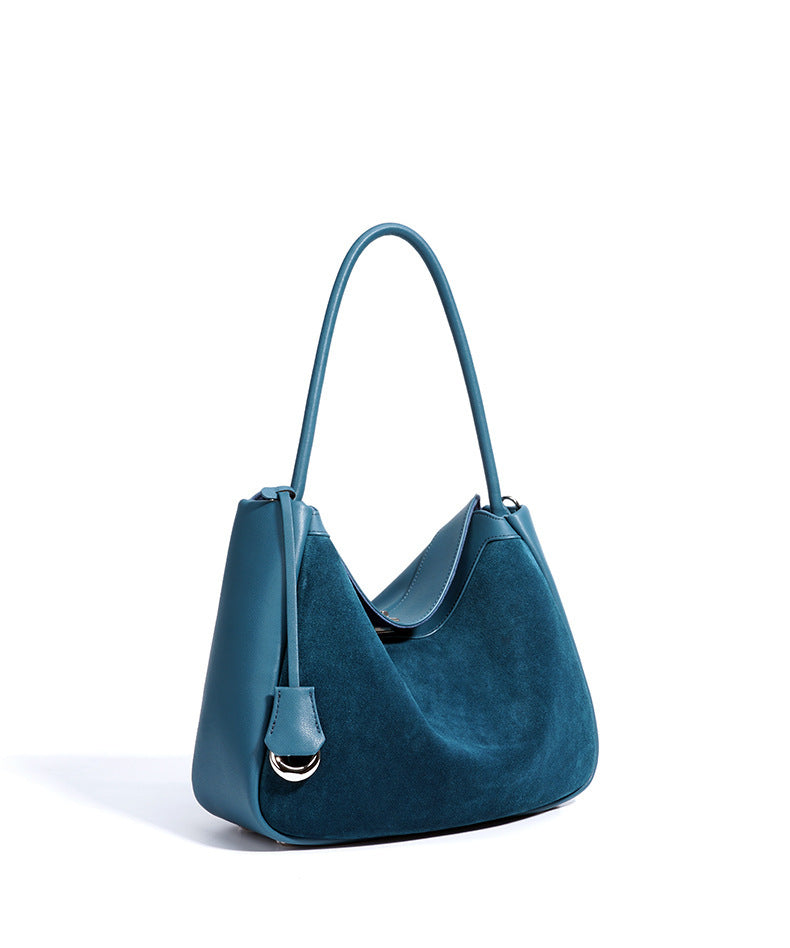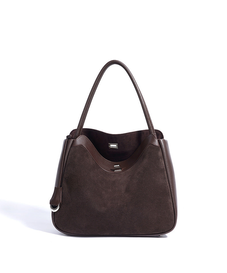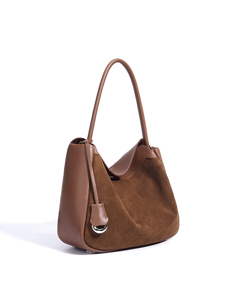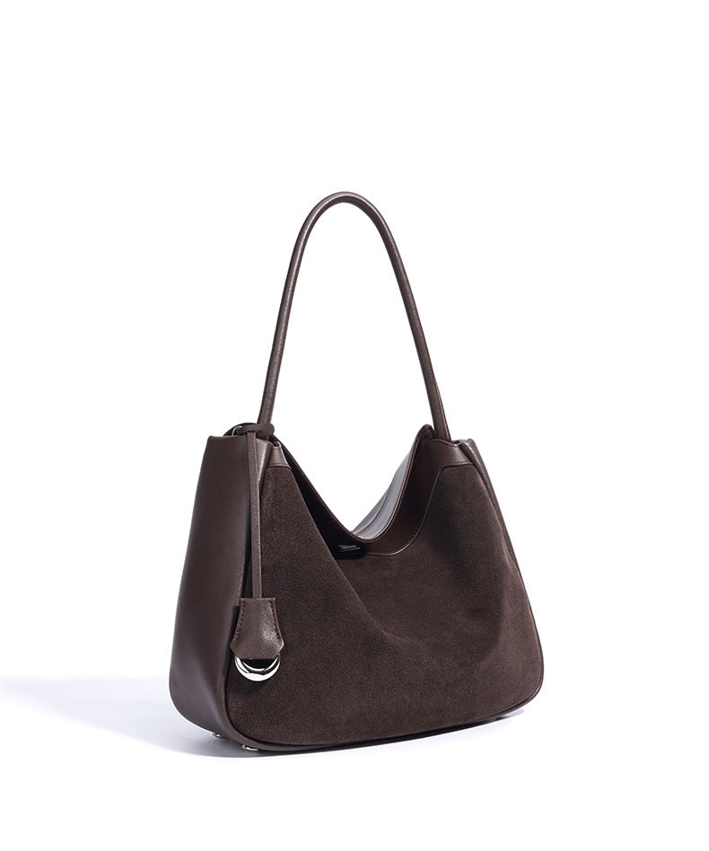 حقيبة كتف أنيقة مصنوعة من جلد سويدي بلون الشوكولاتة الغني مع حواف جلدية ناعمة، تتميز بتصميم منحني وحزام طويل لمظهر أنيق ومريح. مزينة بأجزاء معدنية فضية رقيقة لإطلالة خالدة.
