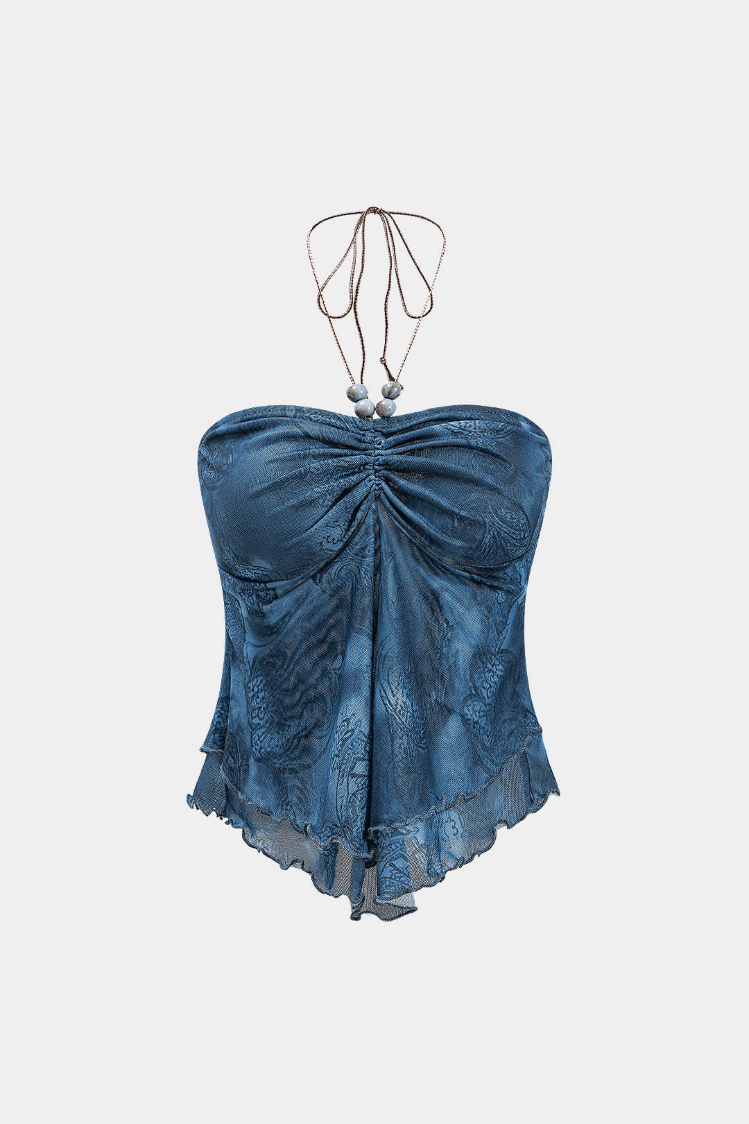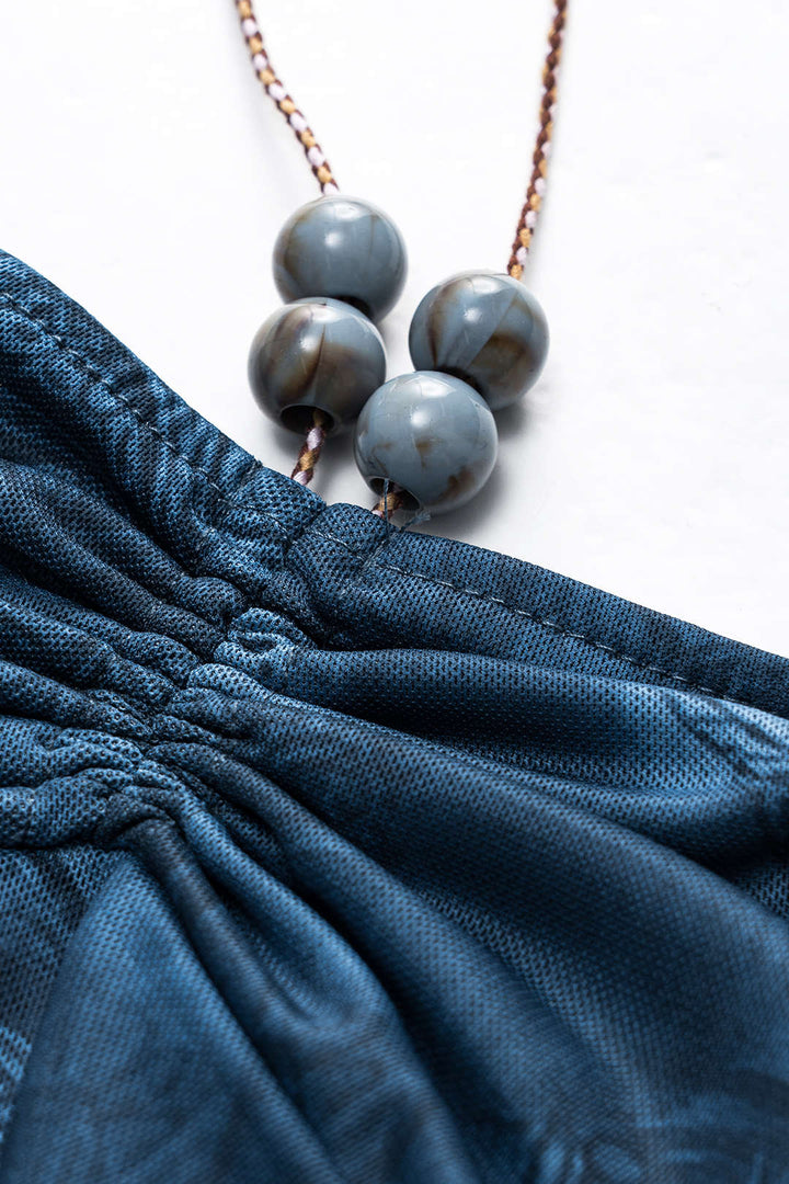 Tie Dye Print Mesh Ruched Beaded Tie-Up Cami Top