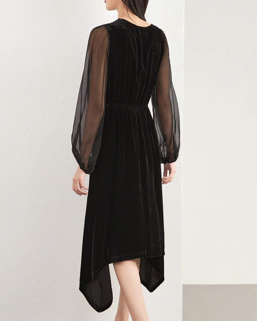 فستان متوسط ​​الطول من المخمل مع رقبة مطرزة وأكمام شبكية – داليان