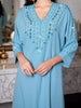 This sky blue column dress features a sleek straight cut and side slits for ease of movement. The collar and sleeves are embellished with delicate beads, adding a touch of sophisticated elegance.