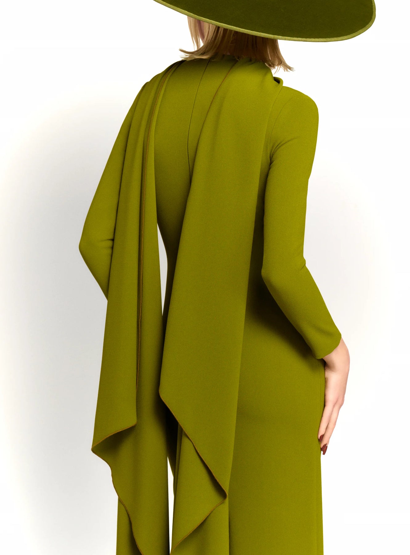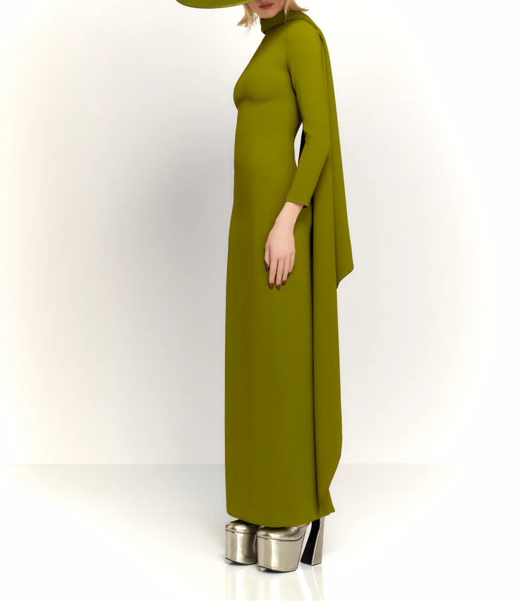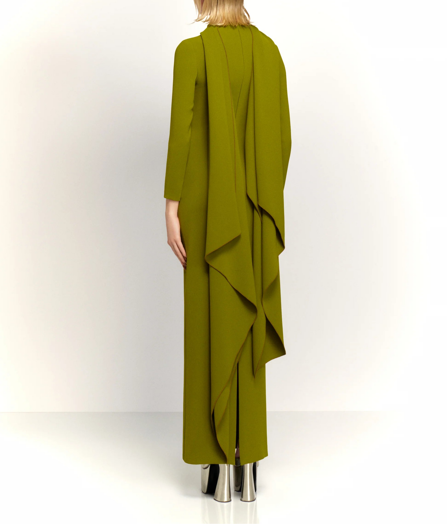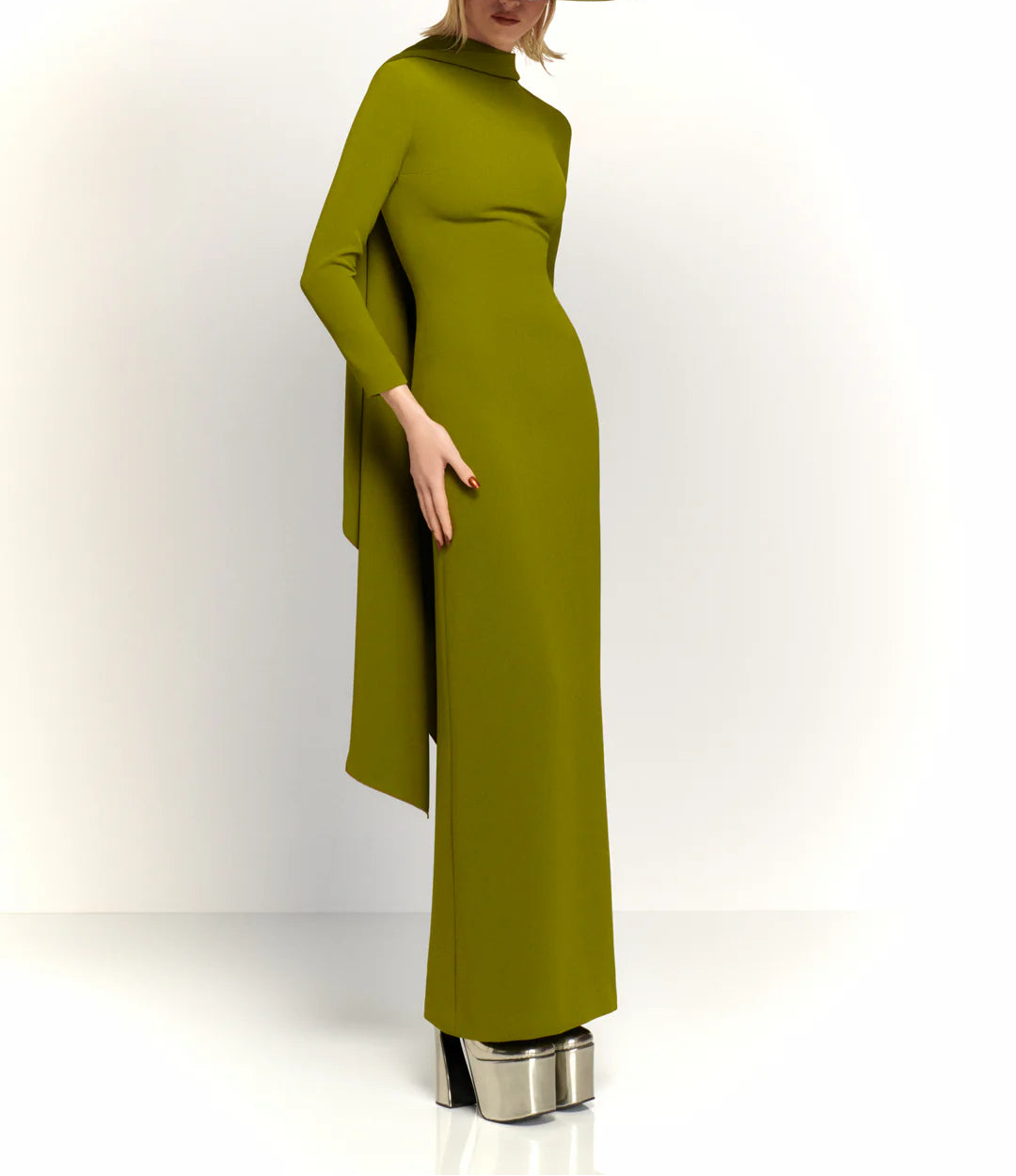 A refined olive-green column gown featuring a sleek asymmetric neckline and tailored long sleeves. The design is elevated with a soft cascading back drape that adds movement and dimension, creating a modern, minimalist silhouette perfect for high-fashion evening events.