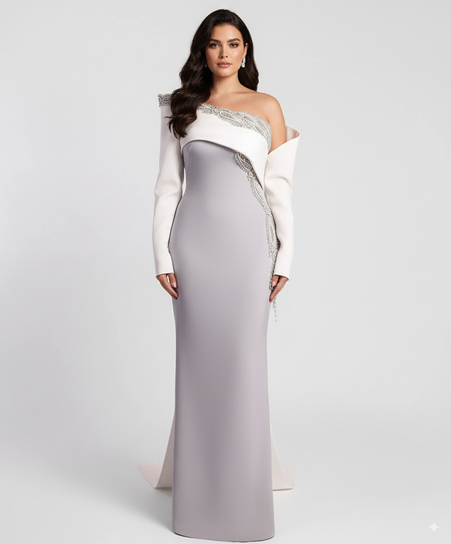 Asymmetrical column dress with structured draped sleeve – NOVII-1