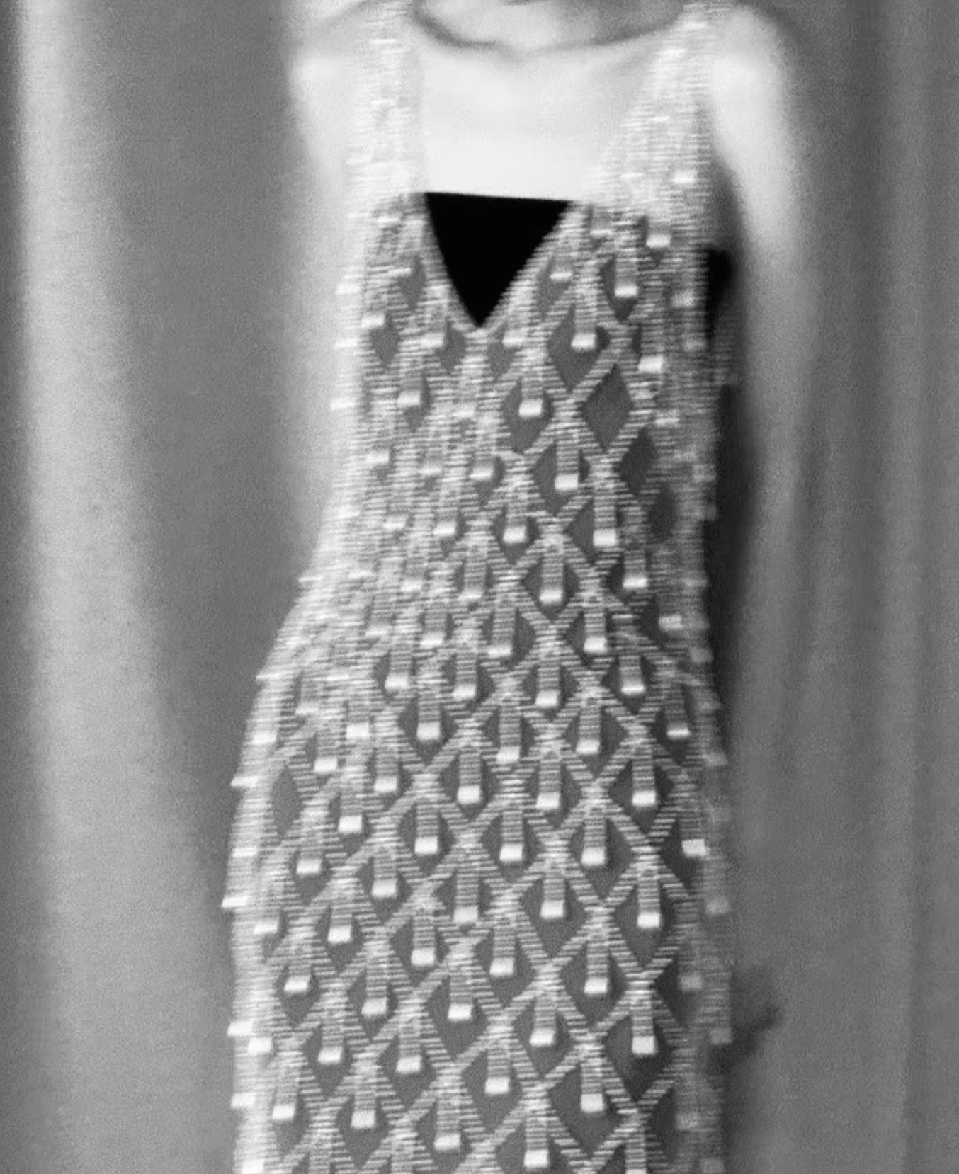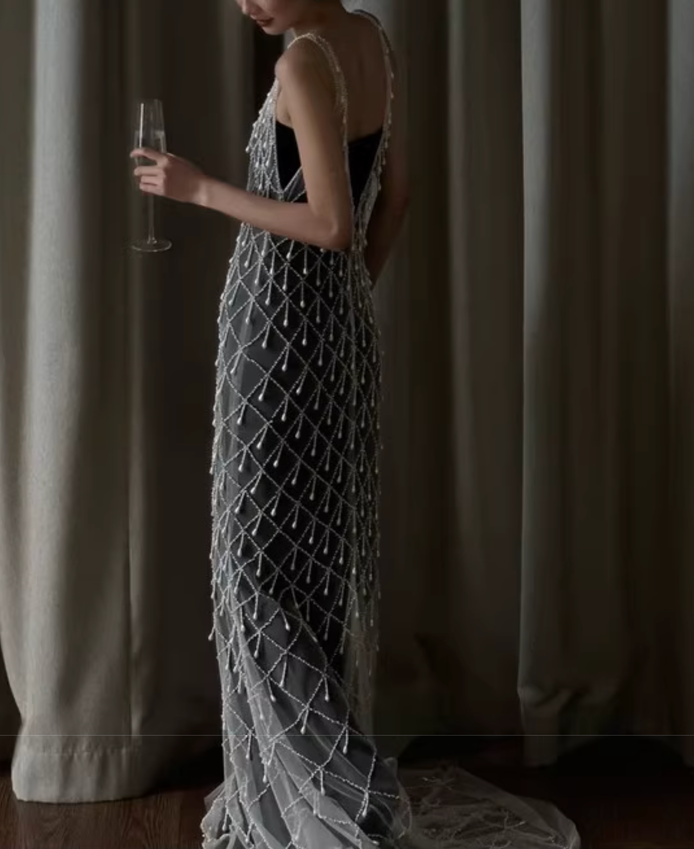 A sheer mesh gown adorned with intricate beaded geometric patterns, layered over a sleek base for a modern yet vintage-inspired look. Its fluid silhouette and luminous beadwork bring refined elegance and statement charm to evening wear. Fabric name: Velvet Bland Size Shoulder (cm) Bust (cm) Waist (cm) Hips (cm) Length (cm) 2XS 38 80 62 89 145 XS 39 84 66 93 145 S 40 88 70 97 145 M 41 92 74 101 145