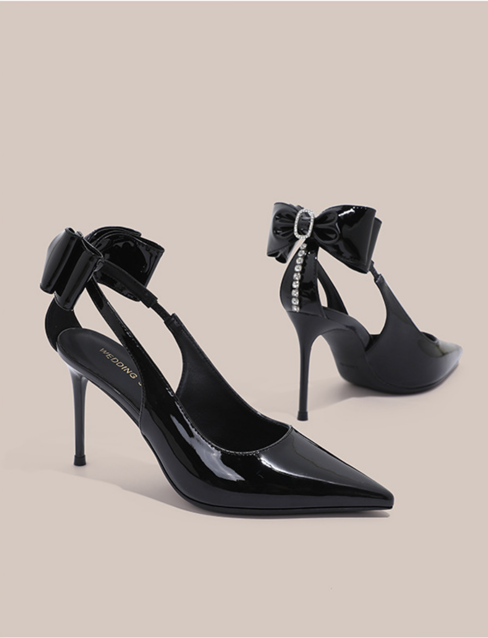 black patent stiletto heels with bow and rhinestone strap – VERA