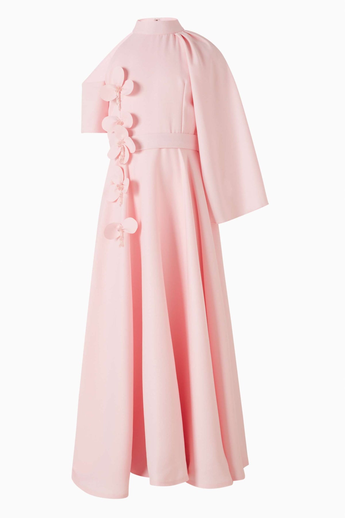 Blush High-Neck Dress with Floral Appliqué Cape Sleeve – SERENA