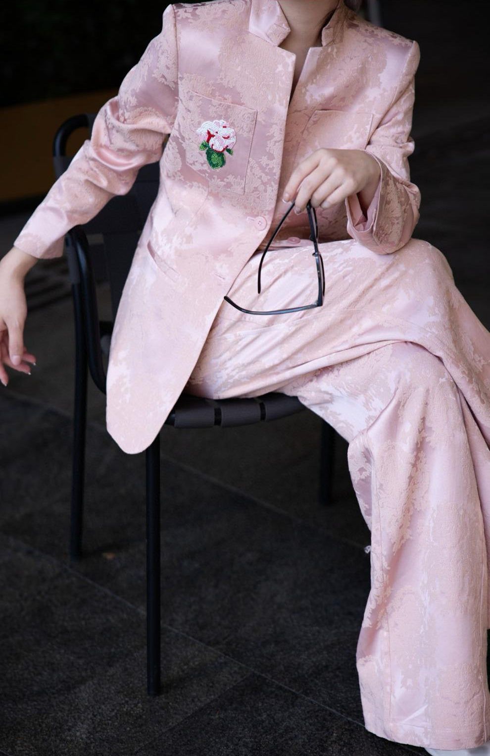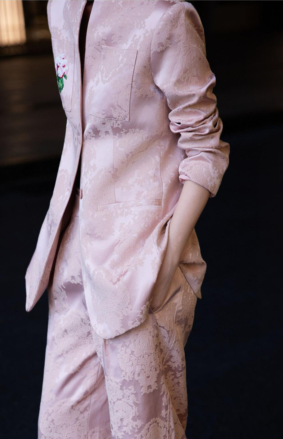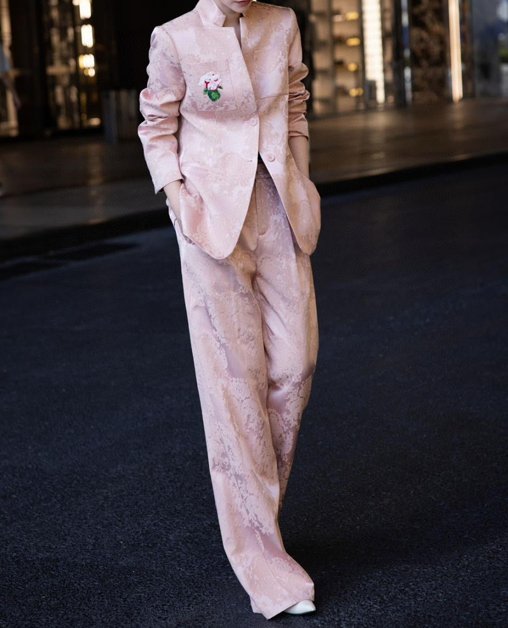 brocade tailored pantsuit with floral patch – VERDANA