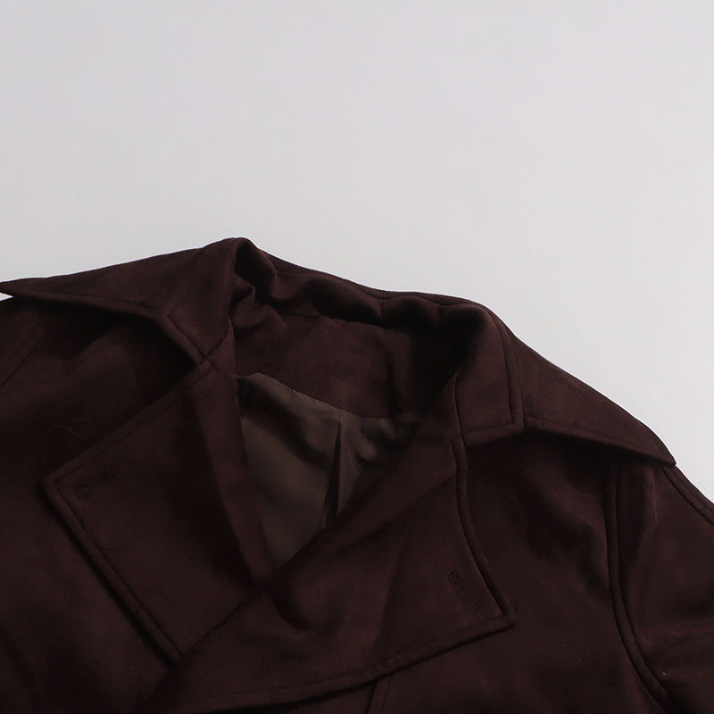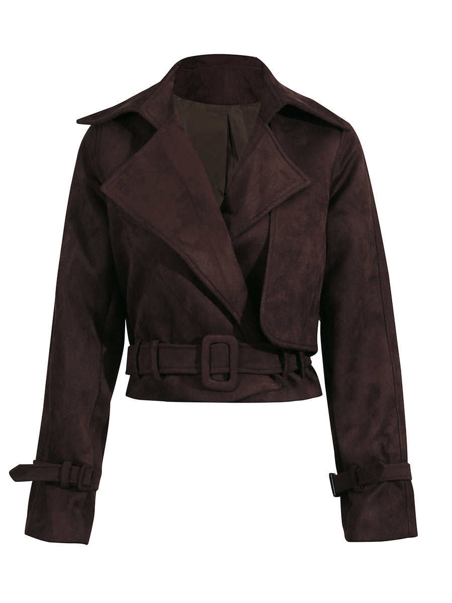 A soft cropped trench jacket featuring a wide lapel collar, adjustable cuffs, and a belted waist—perfect for a chic and timeless outerwear look.