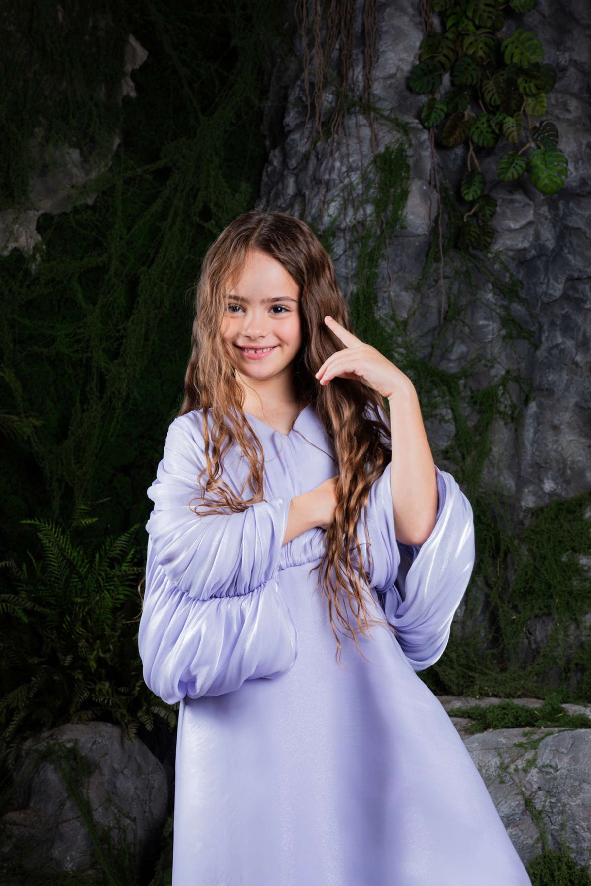 Graceful girls’ maxi dress in a soft rose metallic tone, featuring an elegant draped cape overlay that gathers gently at the front. Flowing and refined, this timeless design offers a luxurious silhouette perfect for special occasions and memorable celebrations.