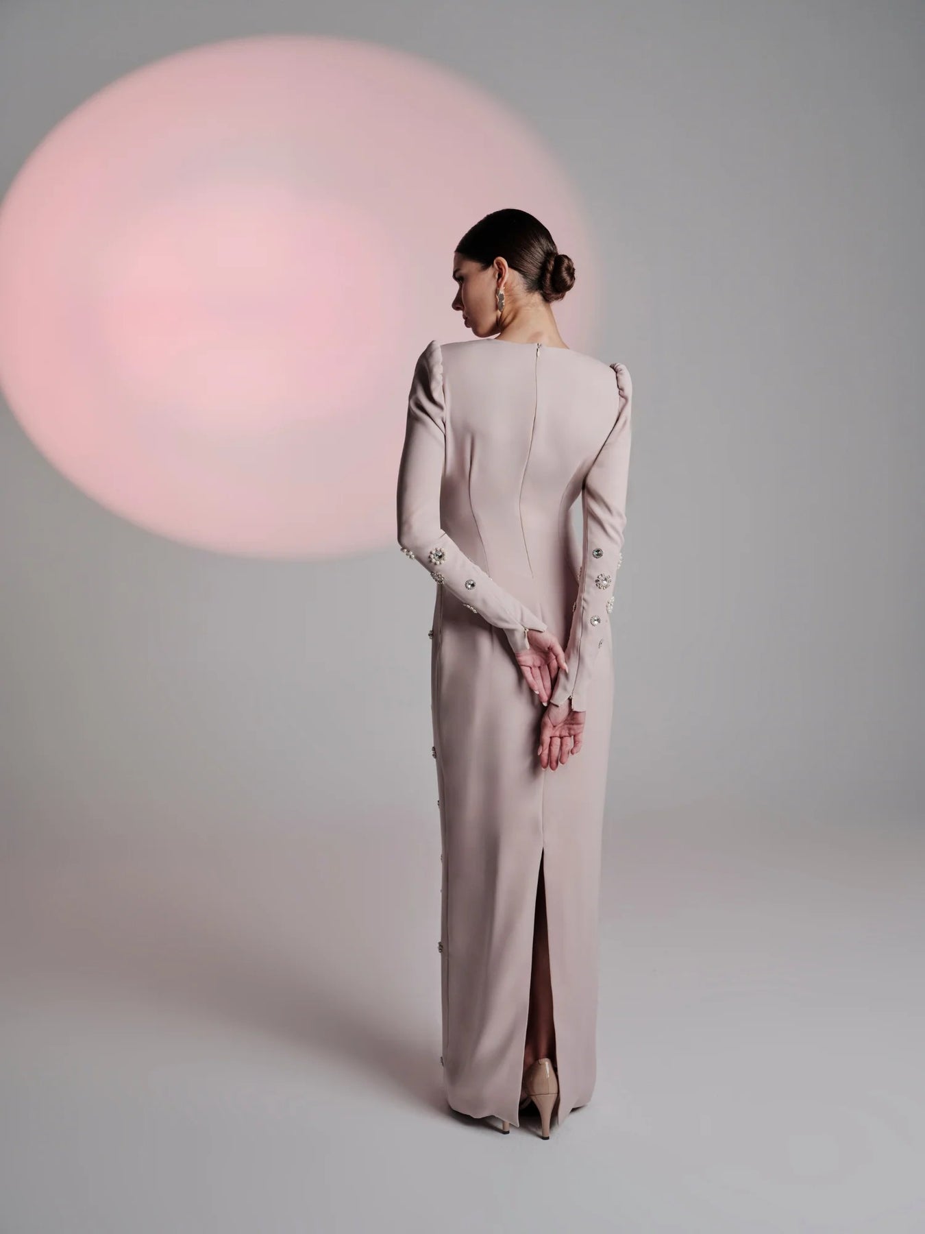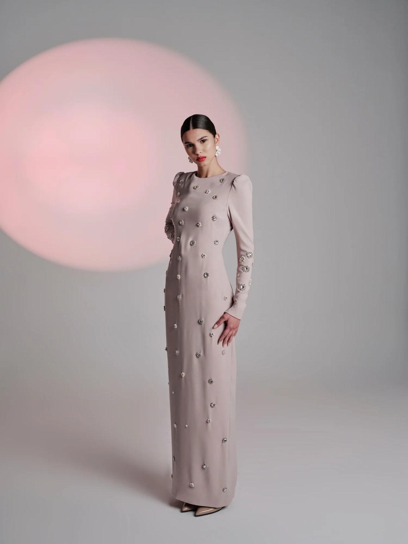 An elegant floor-length column gown crafted in a soft blush-beige tone, adorned with delicate crystal embellishments scattered across the silhouette. Designed with a clean round neckline and long fitted sleeves, this gown offers a refined, graceful look with subtle sparkle. Timeless and sophisticated, it’s perfect for formal evenings, receptions, and understated luxury occasions.