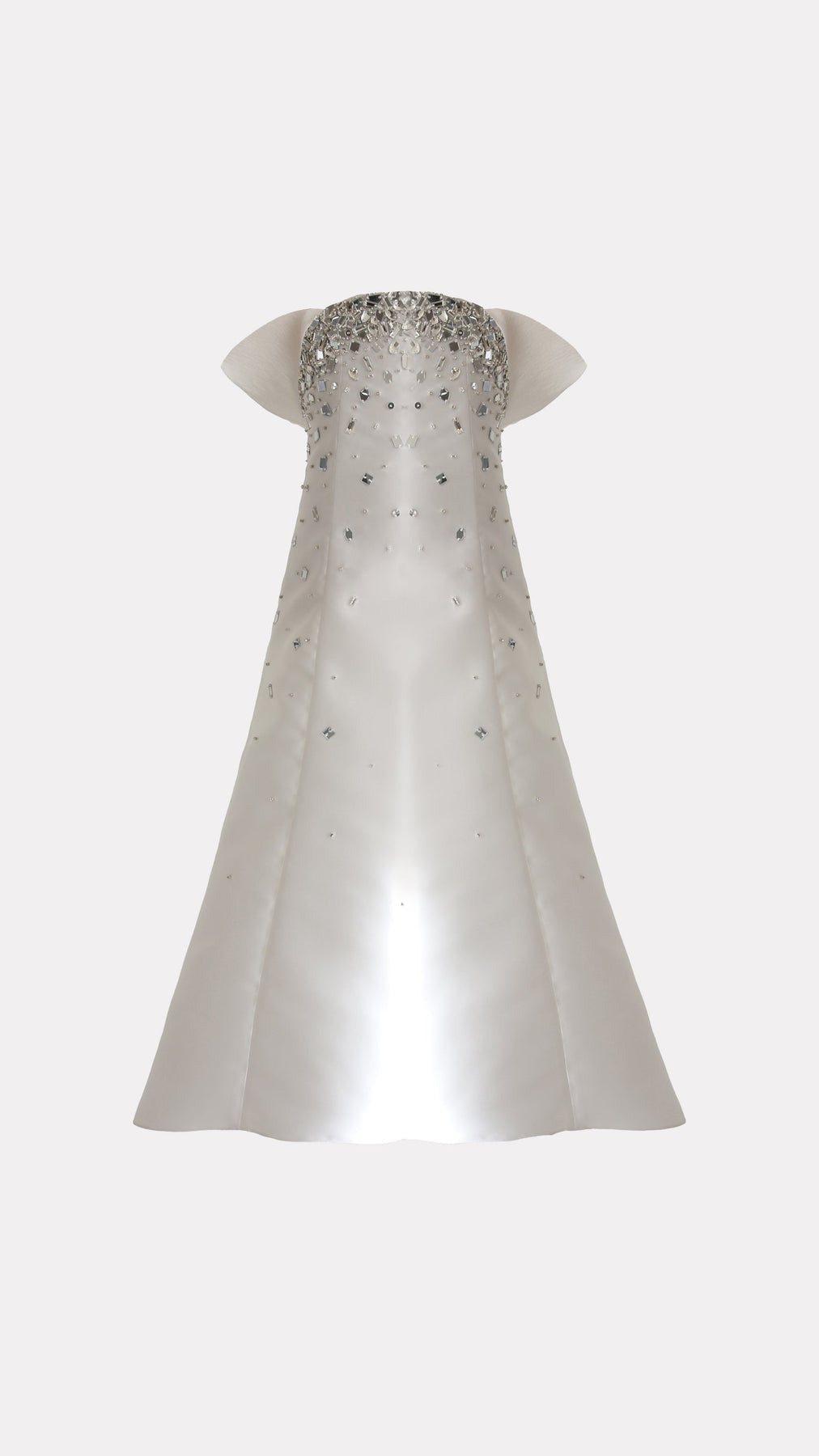 Embellished Strapless Maxi Dress with Mini Cape Sleeves – LUMINA