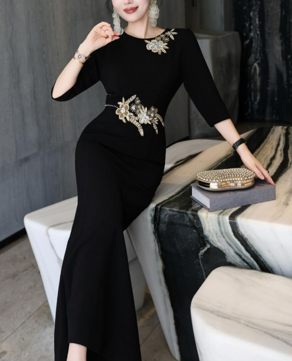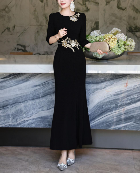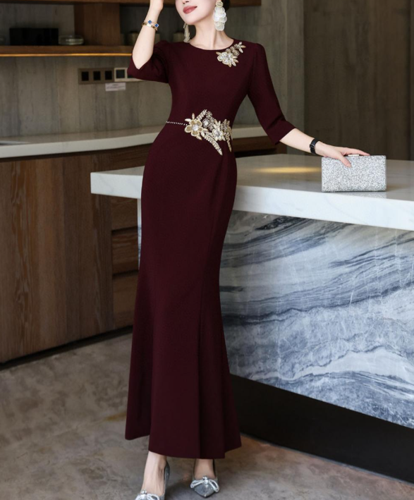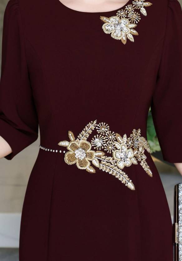 A luxurious deep-burgundy column gown adorned with intricate golden floral embroidery on the shoulder and waist, creating an elegant, sculpted silhouette. Designed with three-quarter sleeves and a streamlined skirt for a refined finish—perfect for upscale events and evening celebrations
