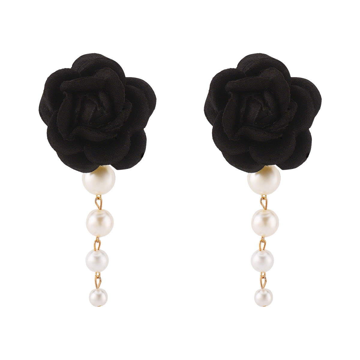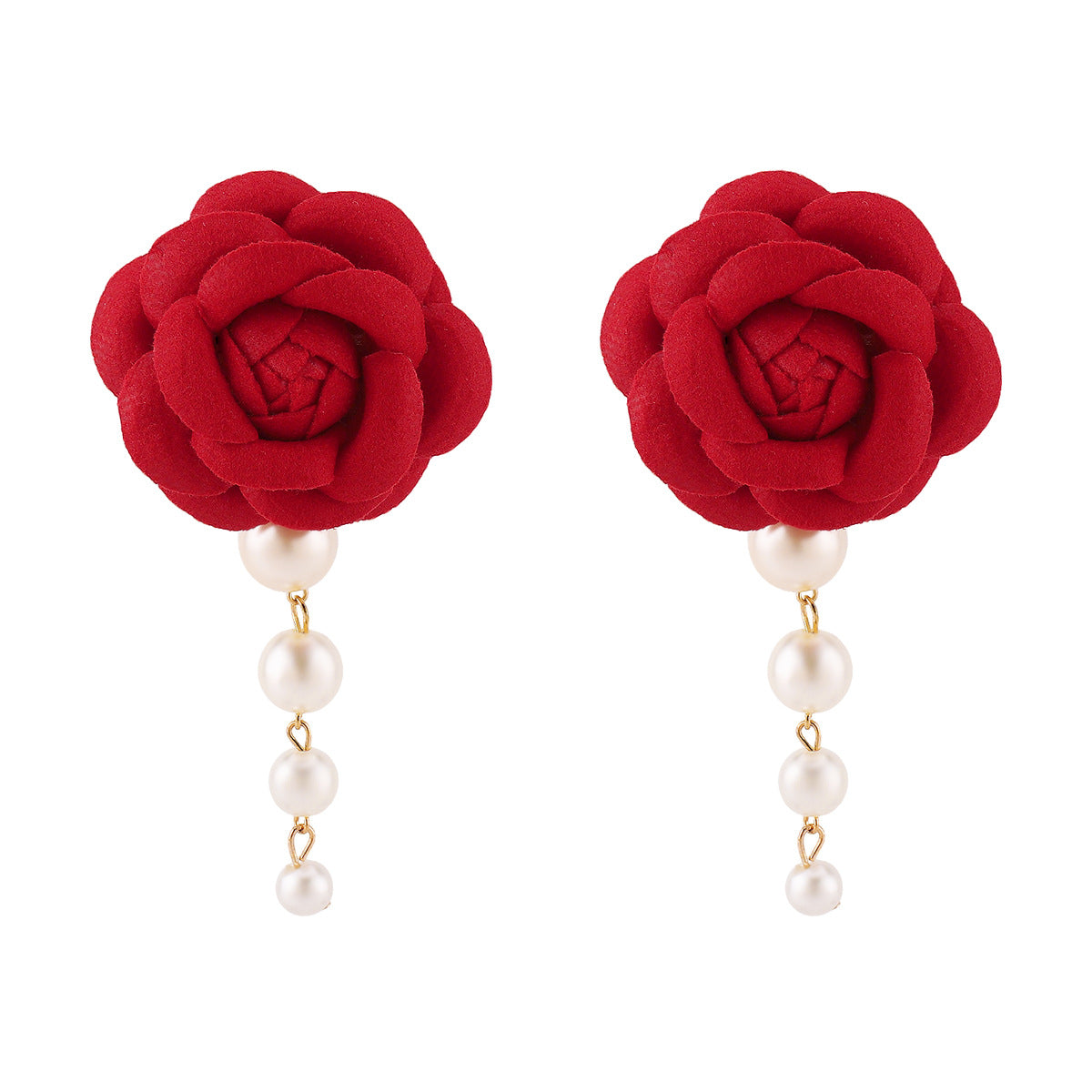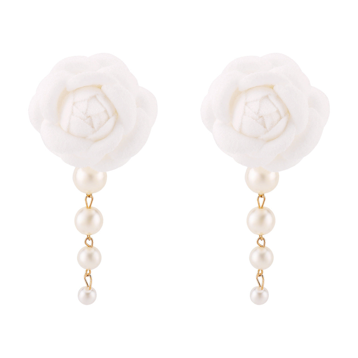 Elegant fabric flower earrings embellished with cascading pearl drops. A classic accessory perfect for adding a romantic and sophisticated touch to any look.
