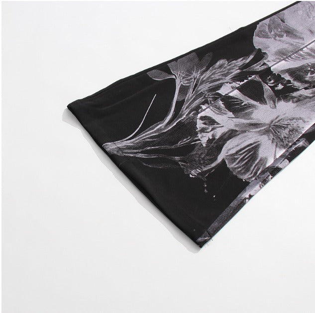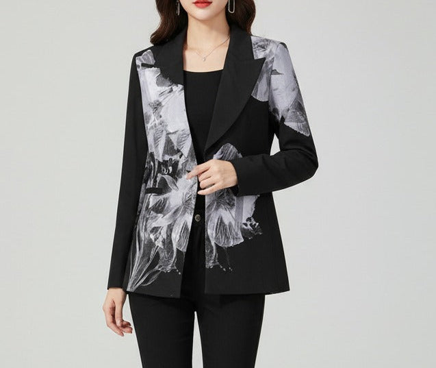Sleek black tailored suit featuring a deep-V blazer and matching wide-leg trousers adorned with abstract white floral prints—combining structure and softness for a bold, modern statement look.
