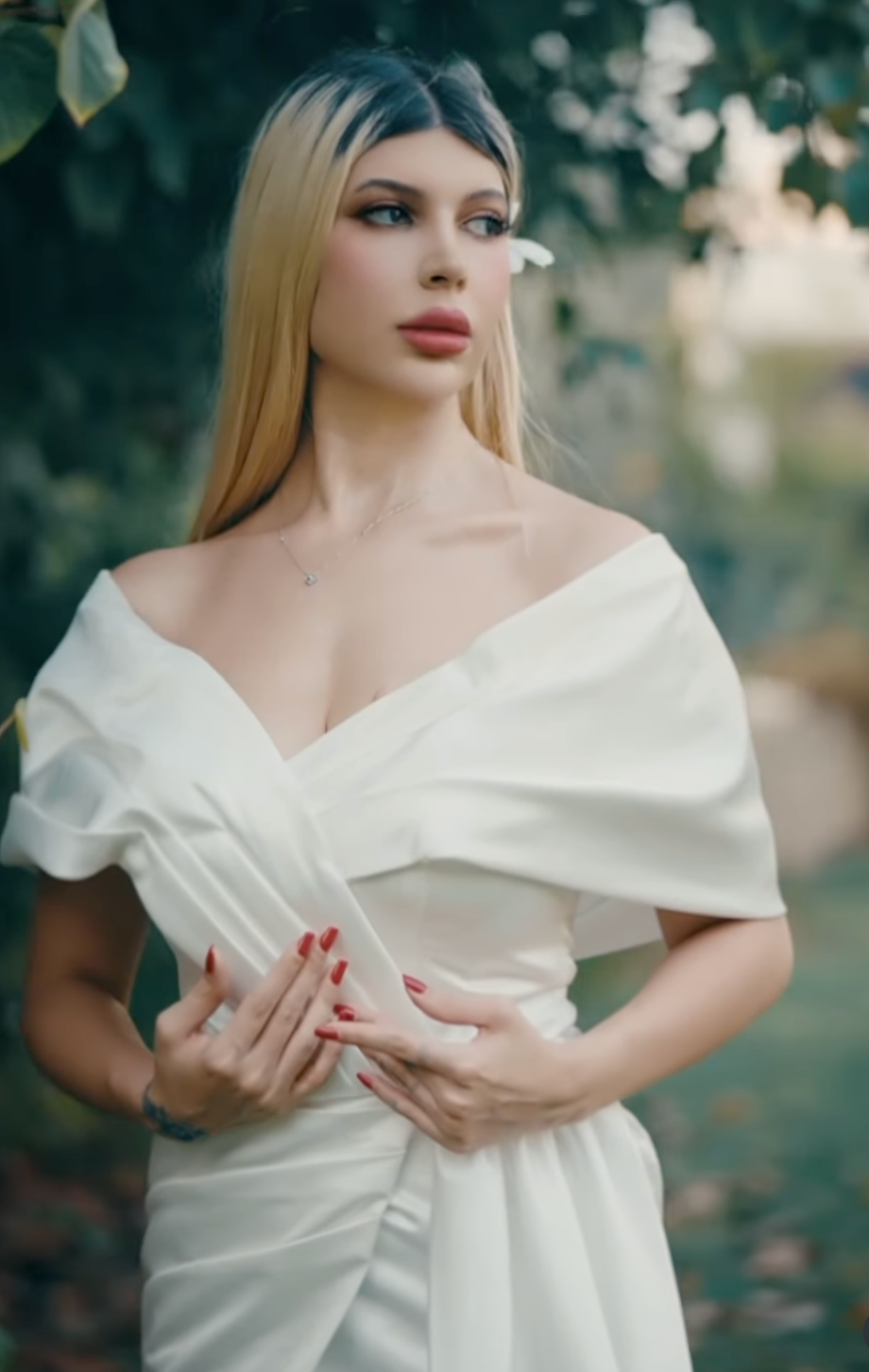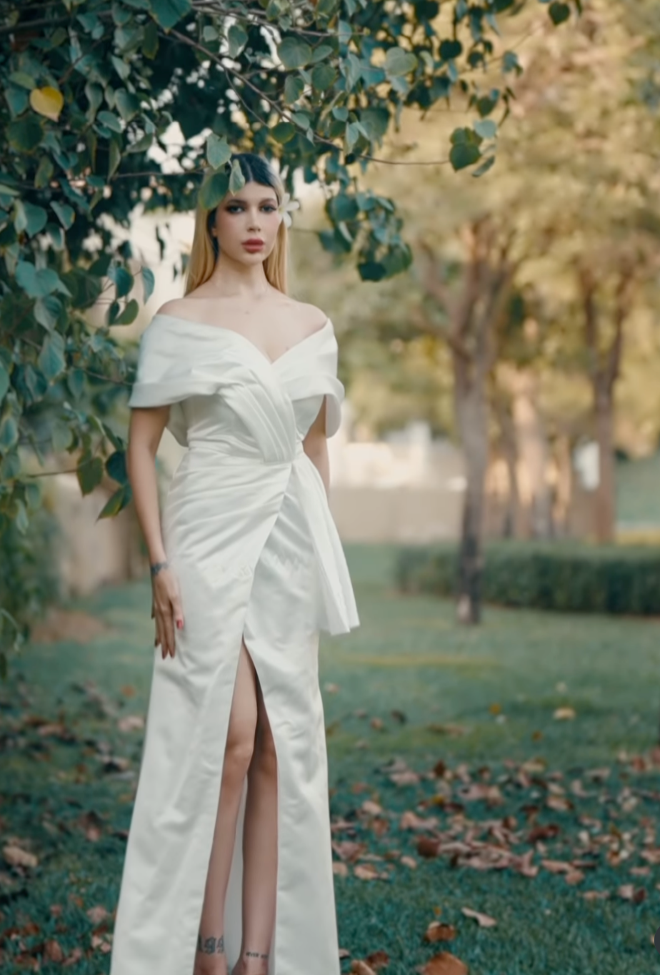 An elegant ivory gown with a sculpted off-shoulder neckline and artful draping across the bodice. Finished with a side bow detail and a subtle slit, this design exudes timeless sophistication—ideal for weddings, galas, and evening soirées.