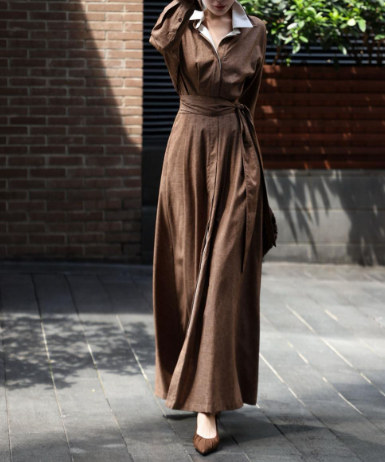 A refined cocoa-brown maxi shirt dress featuring a crisp contrast collar and cuffs, long sleeves, and a soft self-tie belt that shapes the waist effortlessly. Its fluid drape and modern minimalism make it perfect for chic daytime outings, classy casual events, and understated elegant looks.