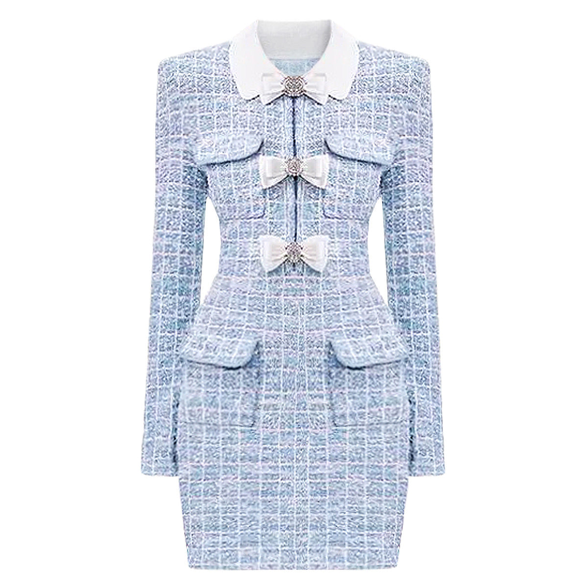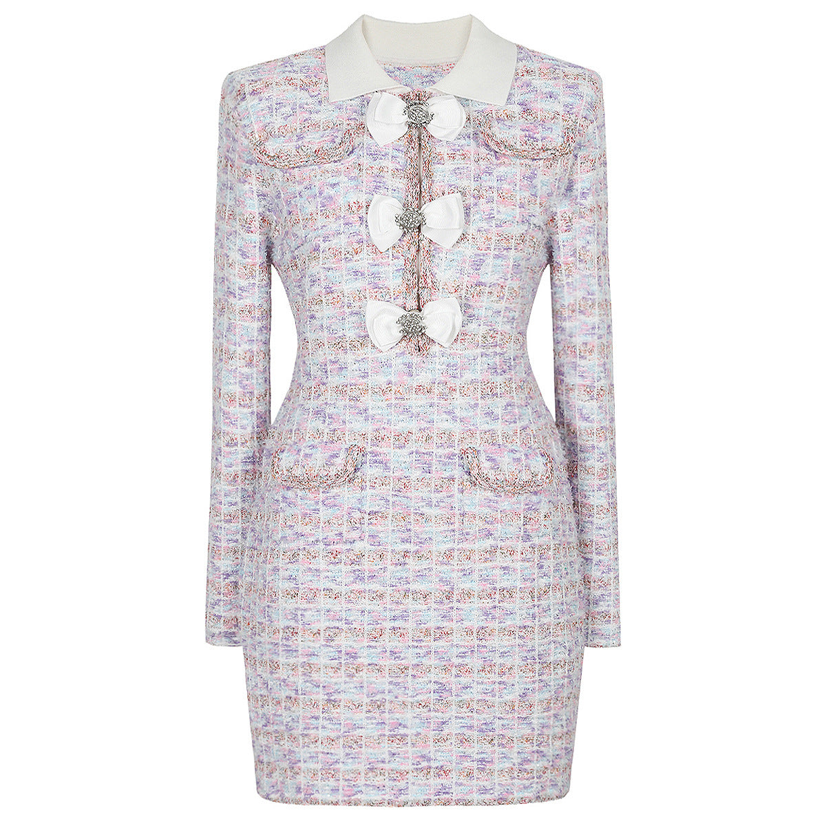 Elegant tweed mini dress featuring structured tailoring, satin bow embellishments, and a contrasting white collar. Its fitted silhouette and pocket details add timeless sophistication to any occasion. Fabric name: viscose fiber Size Bust (cm) Waist (cm) Hips (cm) Shoulder (cm) Length (cm) Sleeve (cm) Xs 86 70 90 36 86 61 S 90 74 94 37 87 62 M 94 78 98 38 88 63 L 98 82 102 39 89 64