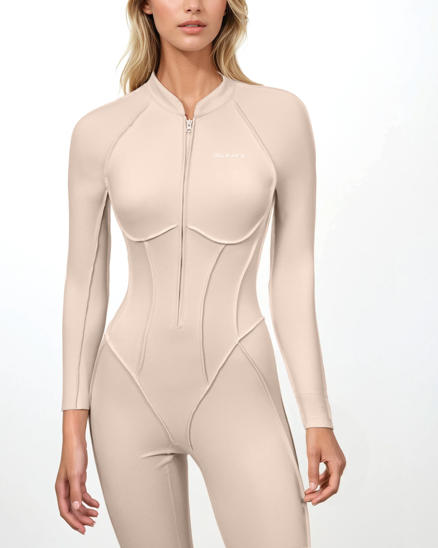 Sophisticated ivory jumpsuit with long sleeves, a high collar, and sleek zip-front closure. Designed with sculpting contour seam detailing that enhances the silhouette, crafted in stretch performance fabric for a sleek, body-hugging fit—perfect for athleisure, yoga, or casual streetwear styling.