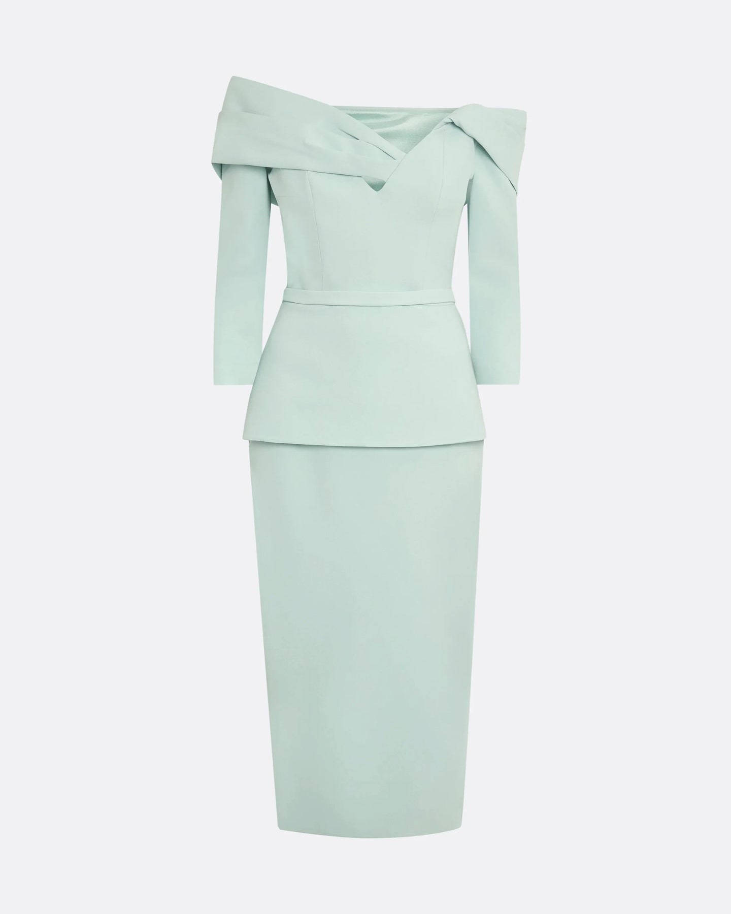 A refined mint-green midi dress featuring an off-shoulder folded neckline, tailored peplum waist, and fitted silhouette. Sophisticated and feminine, perfect for cocktail receptions and elegant soirées.