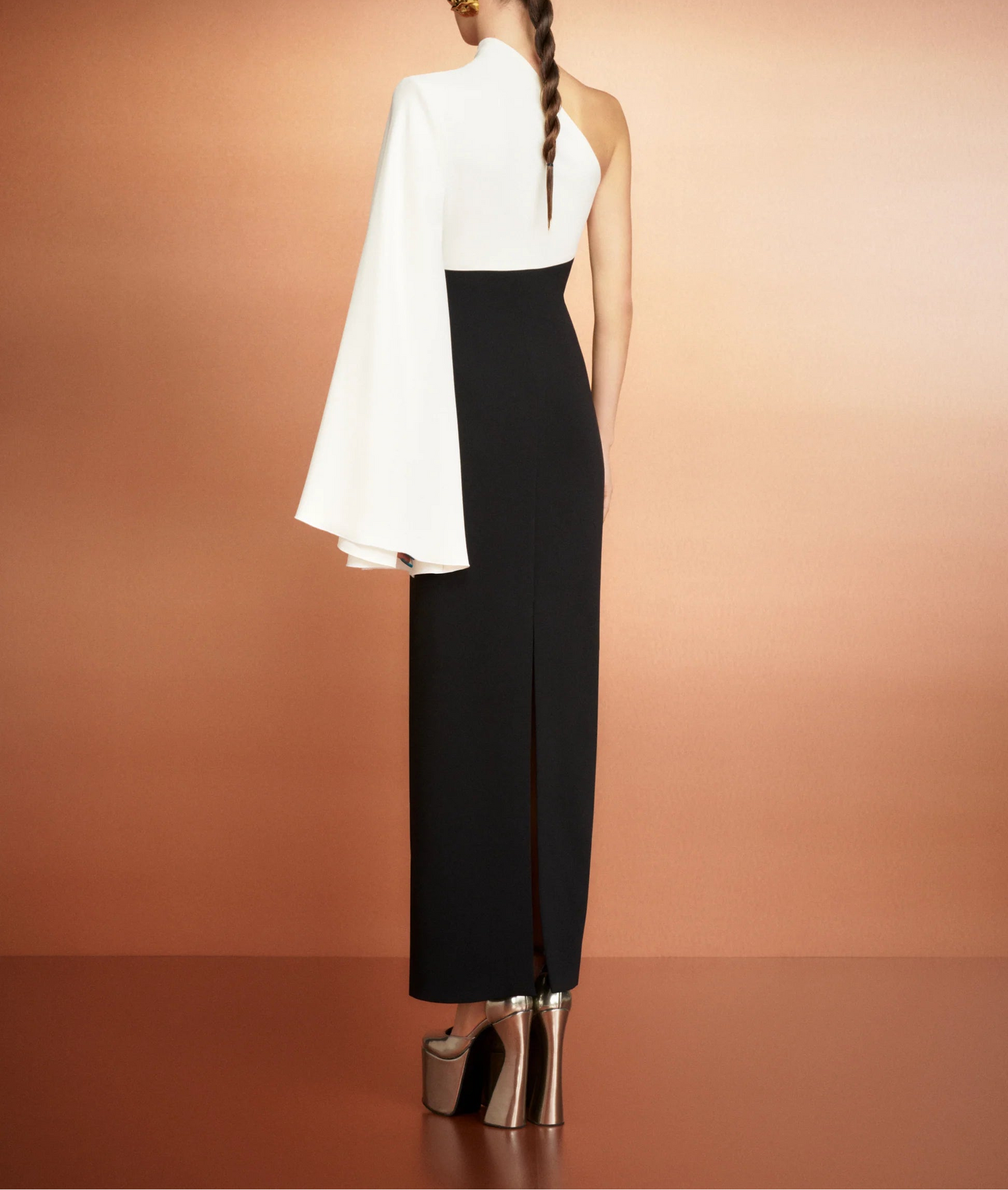 A striking monochrome evening gown featuring a sculpted one-shoulder white bodice that flows into a soft, draped sleeve panel for dramatic movement. The sleek black column skirt creates a bold contrast, delivering a refined, couture-level silhouette perfect for sophisticated events and red-carpet moments.