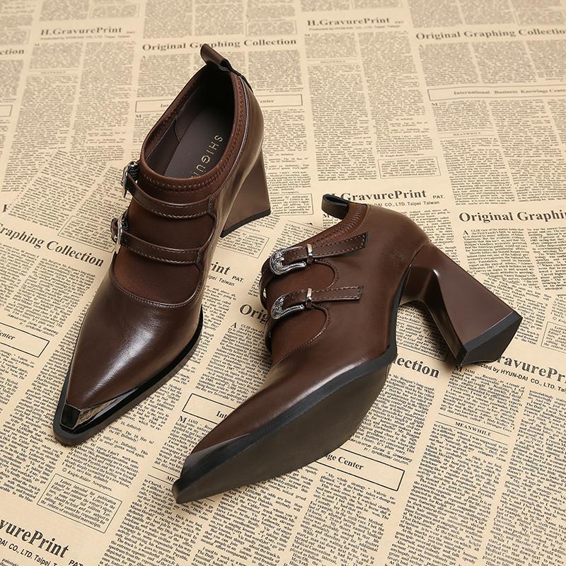 pointed-toe block heel pumps with double buckle straps – VERAVTI